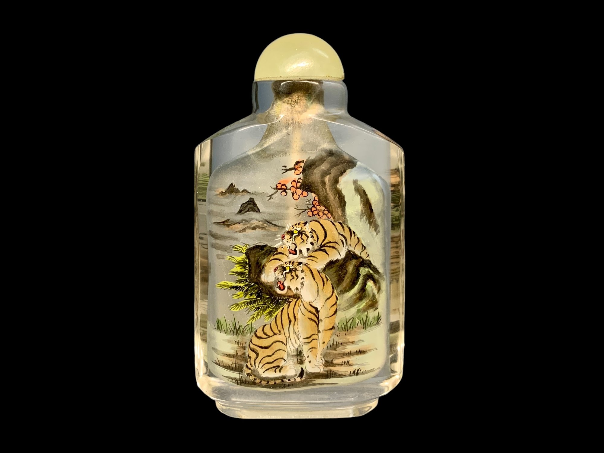 Antique Chinese Painted Tiger Snuff Bottle, reverse/interior paint. This is in very good condition and measures 3” tall.