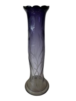 Antique Czech Style Amethyst Etched Glass Vase Iris Decoration. In good used condition. It is approx. 11” tall.