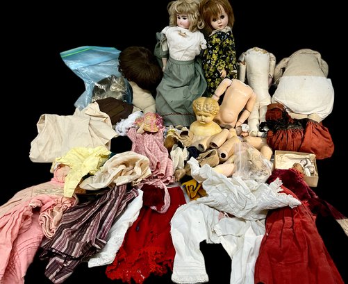 Antique Doll Lot And Parts, 2 dolls, misc doll parts, bodies, clothes, shoes, accessories. Some condition is poor, this lot is being sold “as is.”