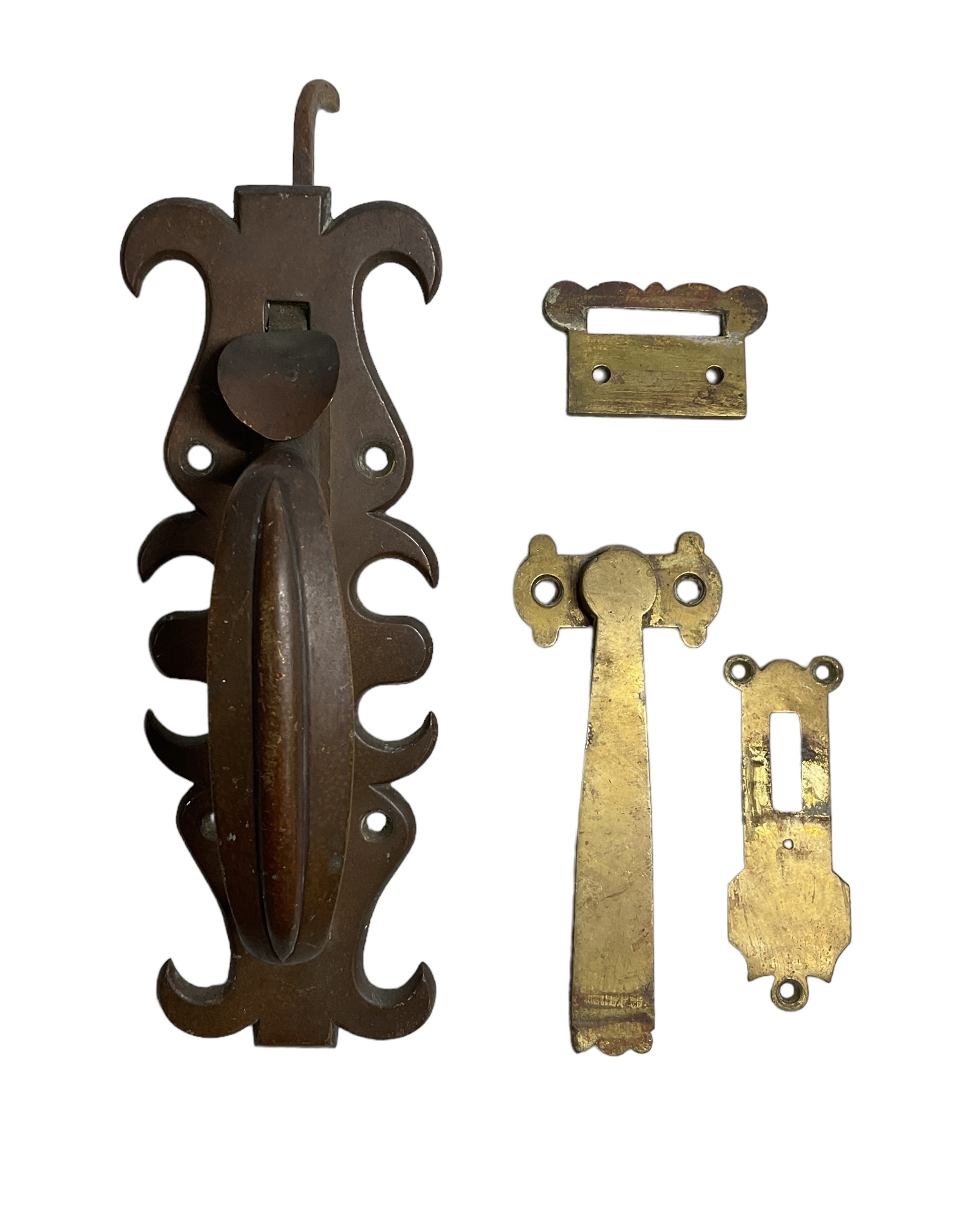 Antique Fancy Brass Door Handle And Latch And Miscellaneous Brass Fittings. In good used condition with a nice patina. The door handle measures approx. 8” tall by 3” wide by 6.5” deep.