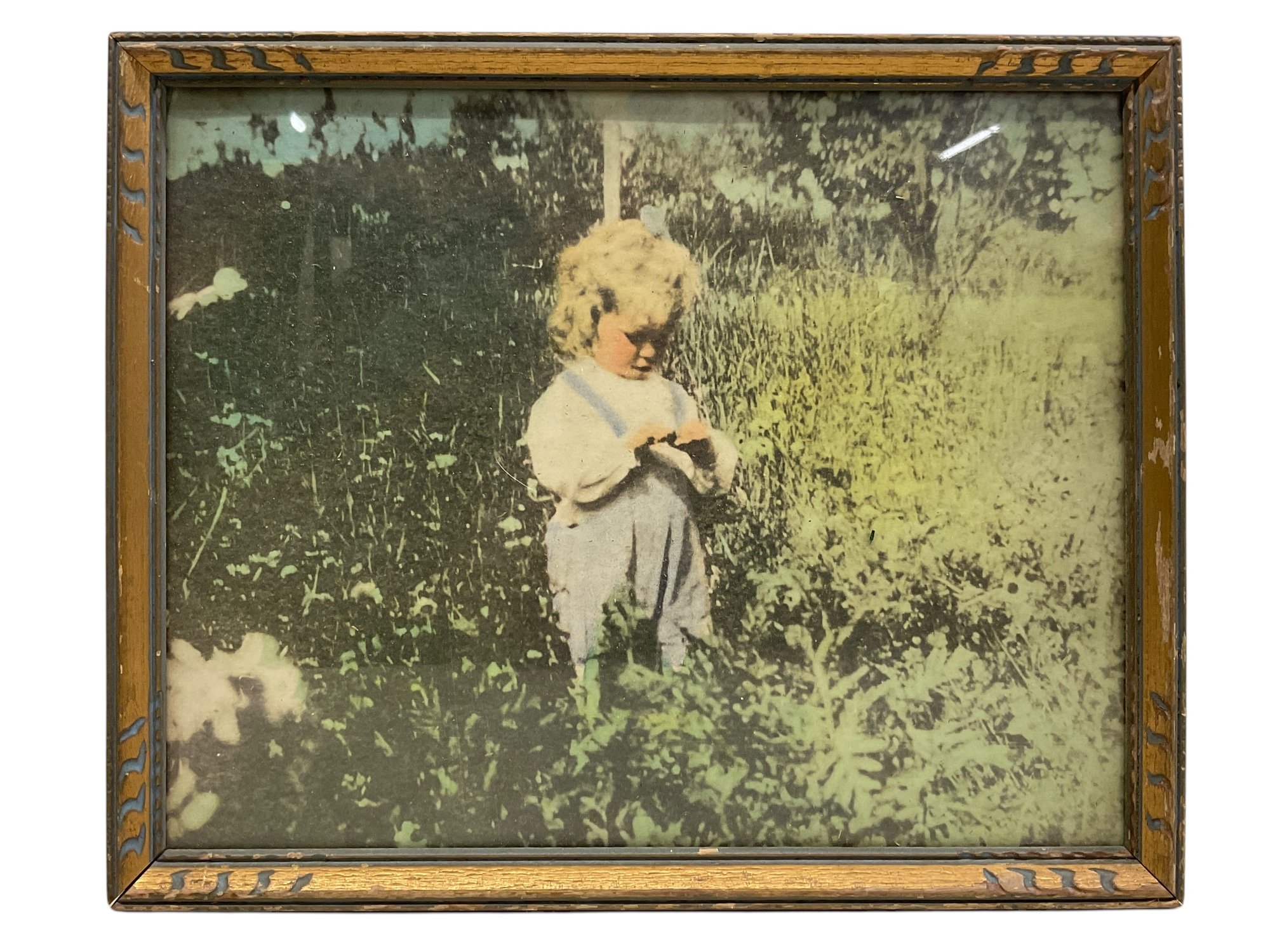 Antique Framed Colorized Photo Of Small Child In Field, measures 7.5” x 10.”