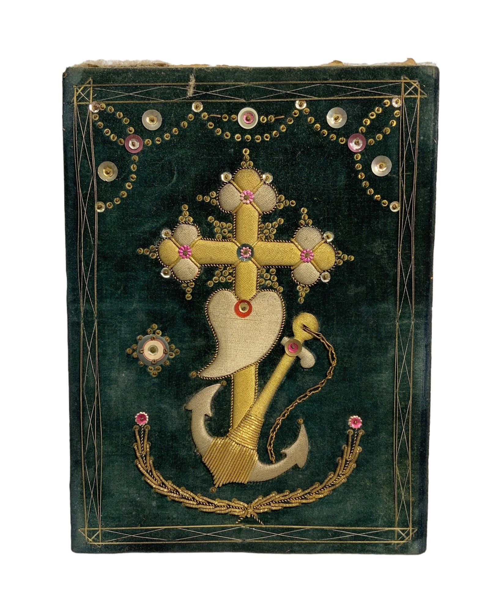 Antique Hand Embroidered Sailors Valentine On Velvet With Metallic Thread. In good condition. It is approx. 9.25” by 7”.