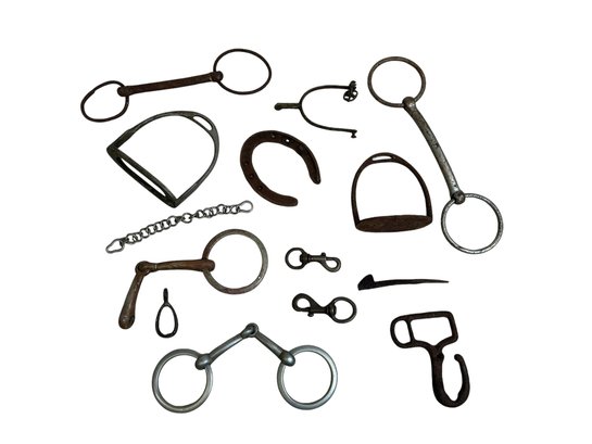 Antique Horse Bits Riding Stirrups Spur Bronze Key Holders Wrought Iron Latch Horseshoe Etc. Nice country house lot. All in fair to good condition with wear, corrosion etc. Largest piece is approx. 13.”