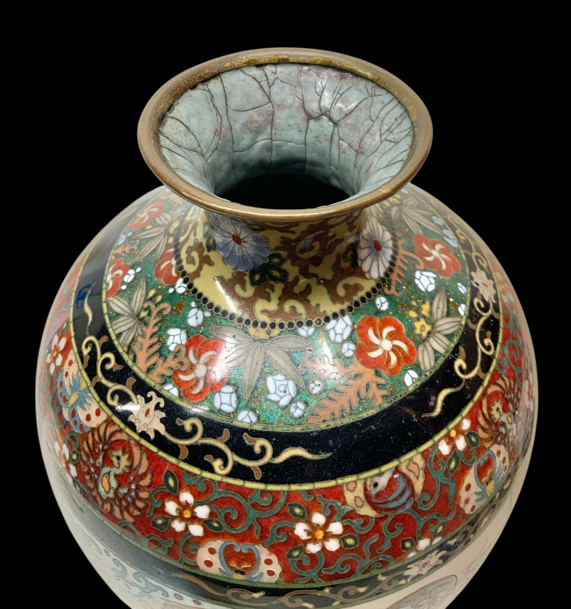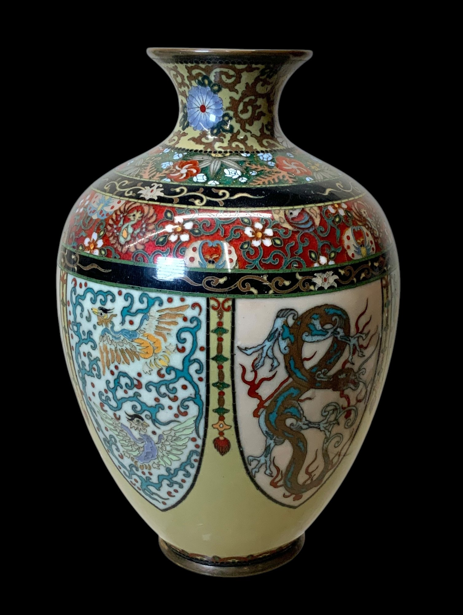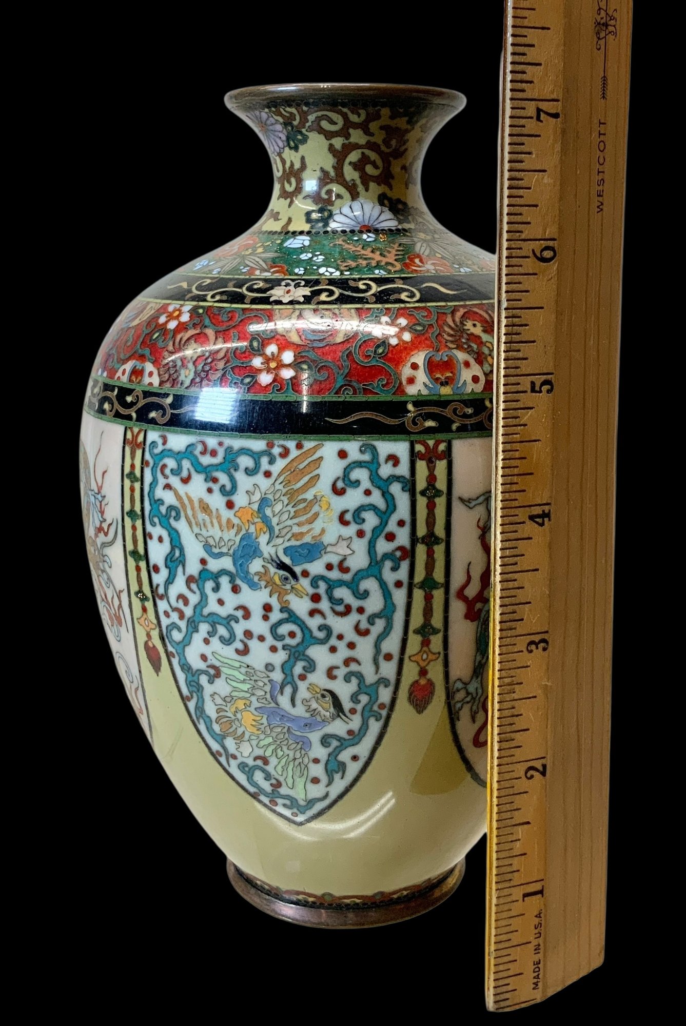 Antique Japanese Cloisonne Enamel And Copper Vase. Dates to the Meiji Period (second half of 19th century). Features intricate and vibrant cloisonné enamel designs of dragons, birds and flowers. Great condition, no visible chips. Measures approximately 7.5” tall.