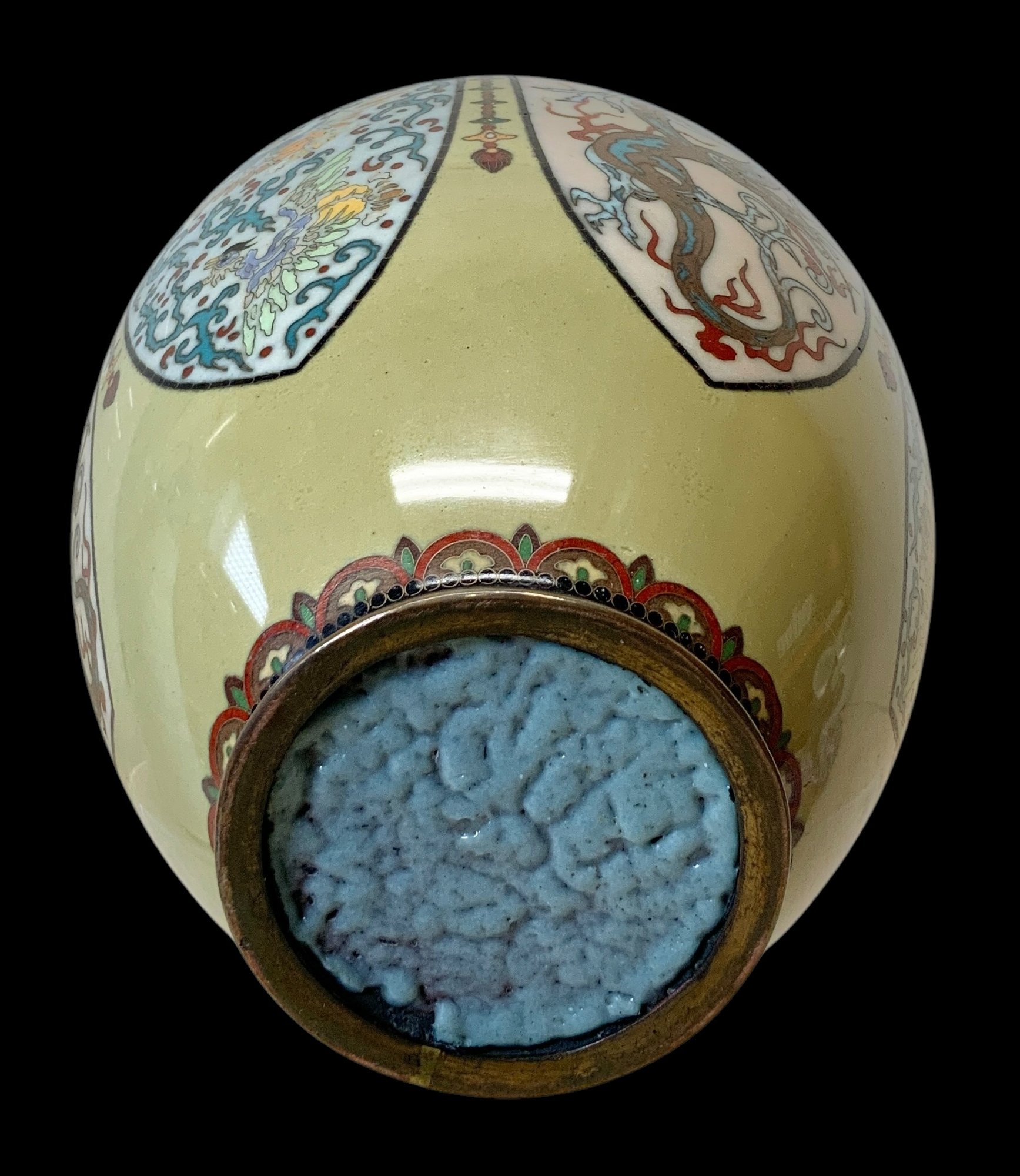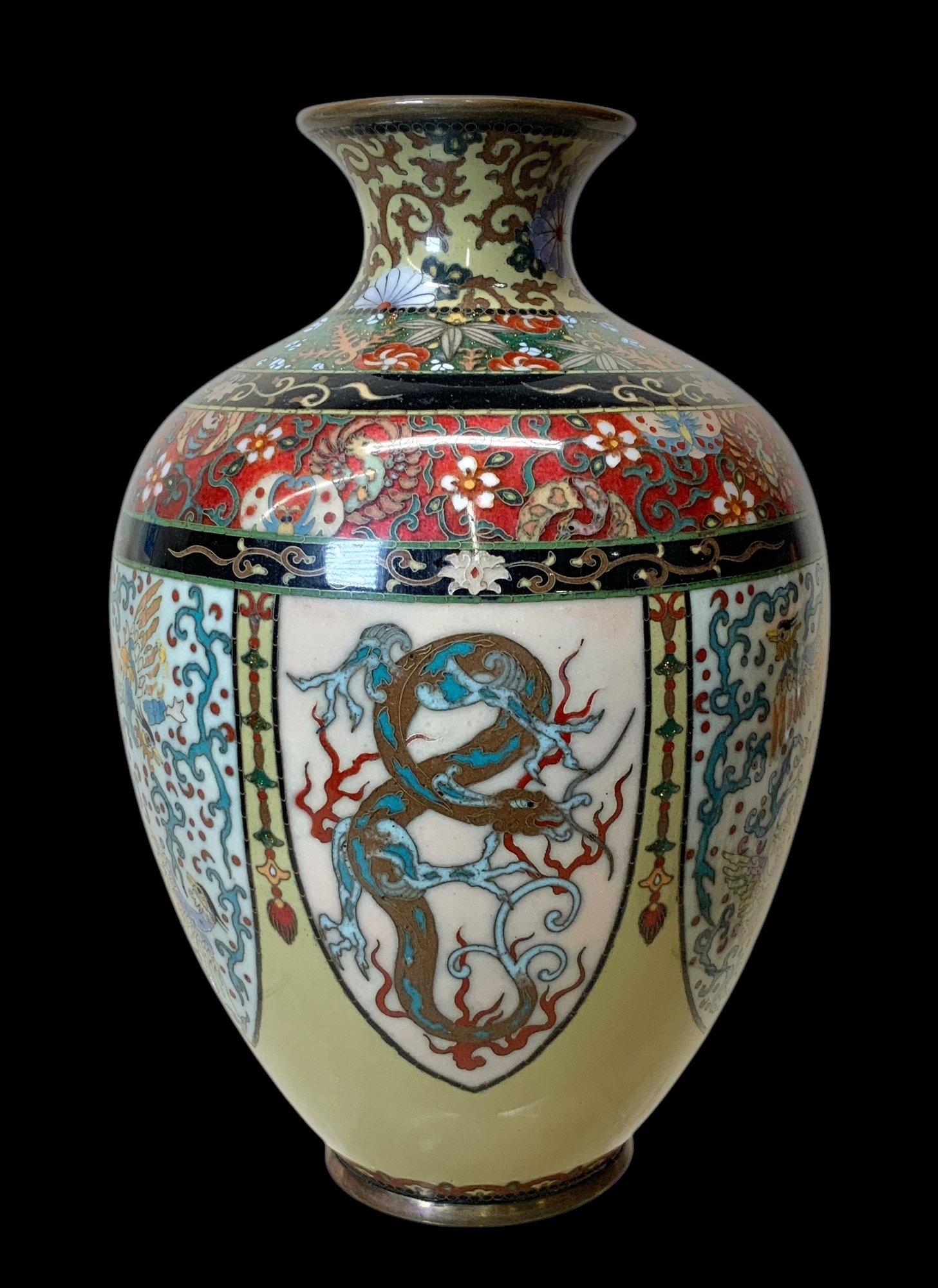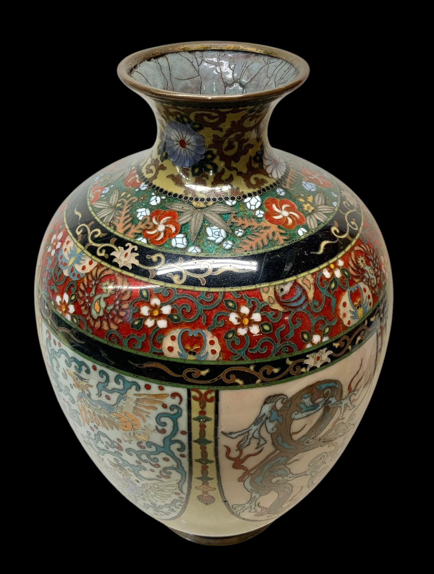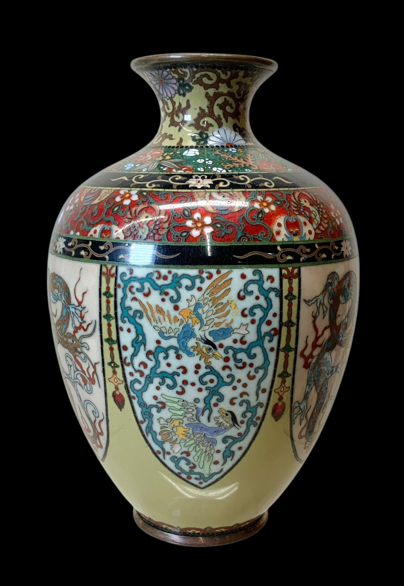 Antique Japanese Cloisonne Enamel And Copper Vase. Dates to the Meiji Period (second half of 19th century). Features intricate and vibrant cloisonné enamel designs of dragons, birds and flowers. Great condition, no visible chips. Measures approximately 7.5” tall.