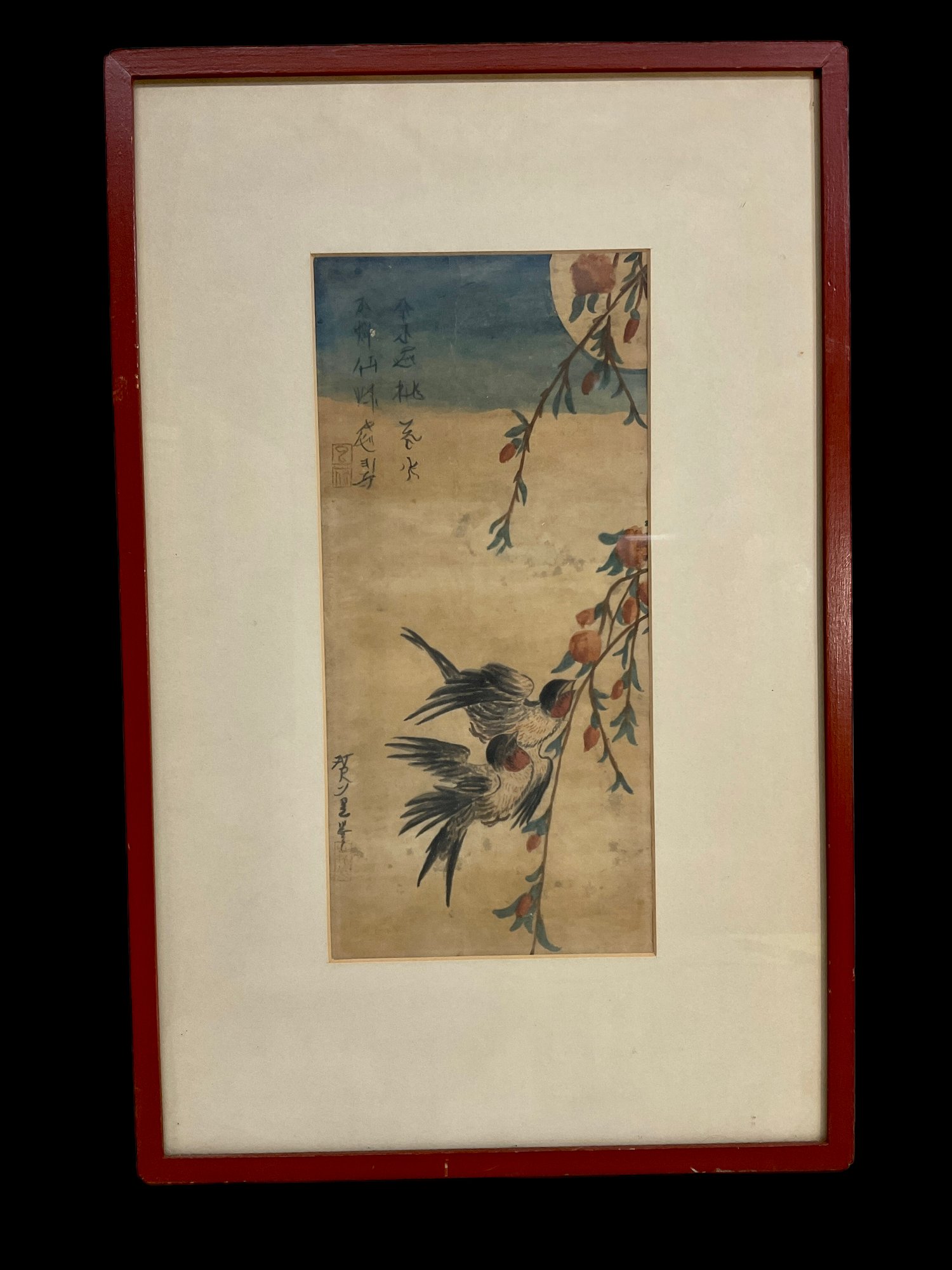 Antique Japanese Watercolor On Paper B, Measures 13.25”x 6.25”. This is in a matching frame with lot 2. Antique Japanese Watercolor On Paper A.” Lovely as a pair.