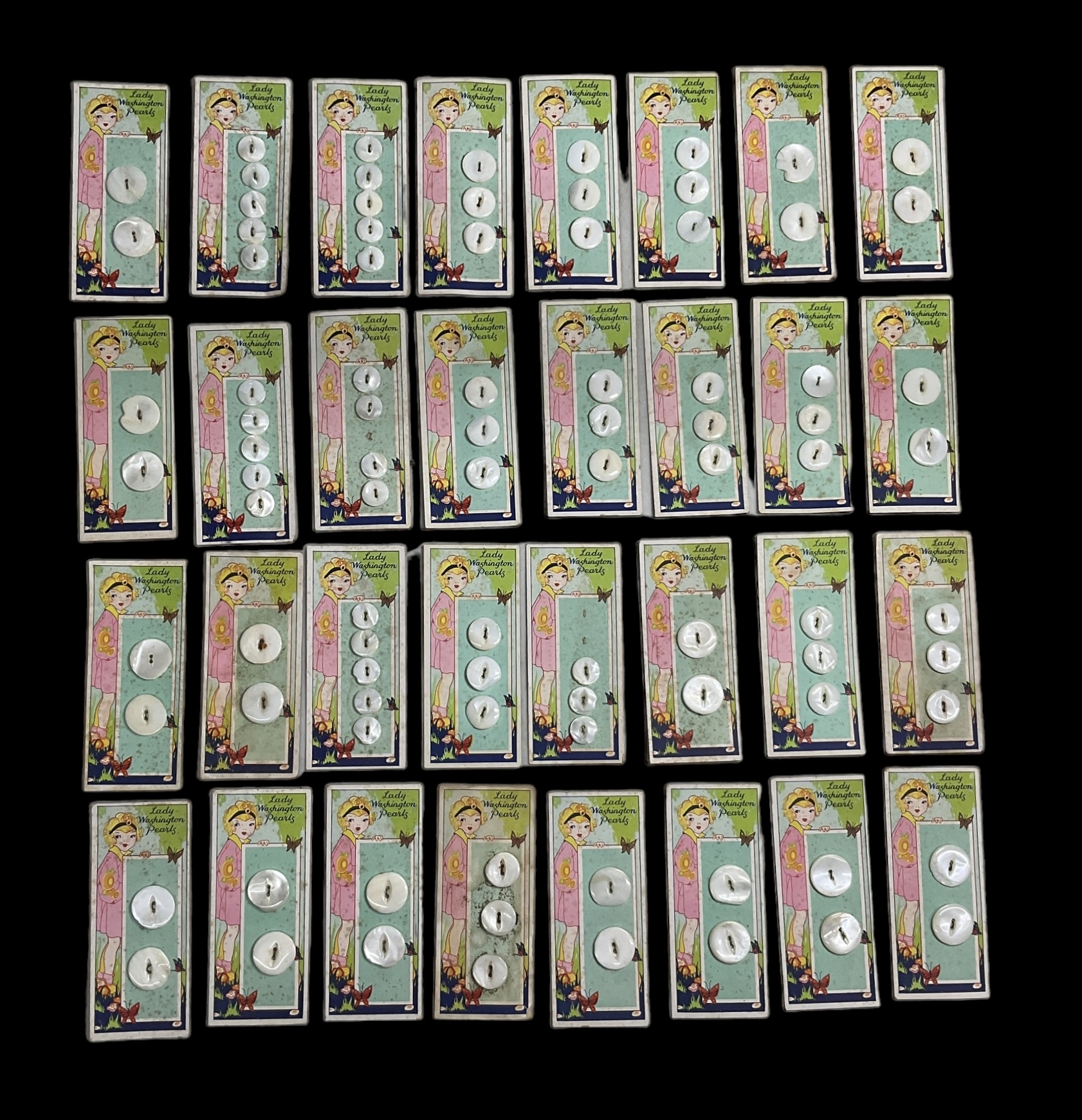 Antique Lady Washington Pearls Buttons On Original Advertising Cards 32 Cards In Total. In fair to good condition, please note that two of the cards are missing buttons and some of the buttons may have chips. The cards are approx. 4.75” by 2”.