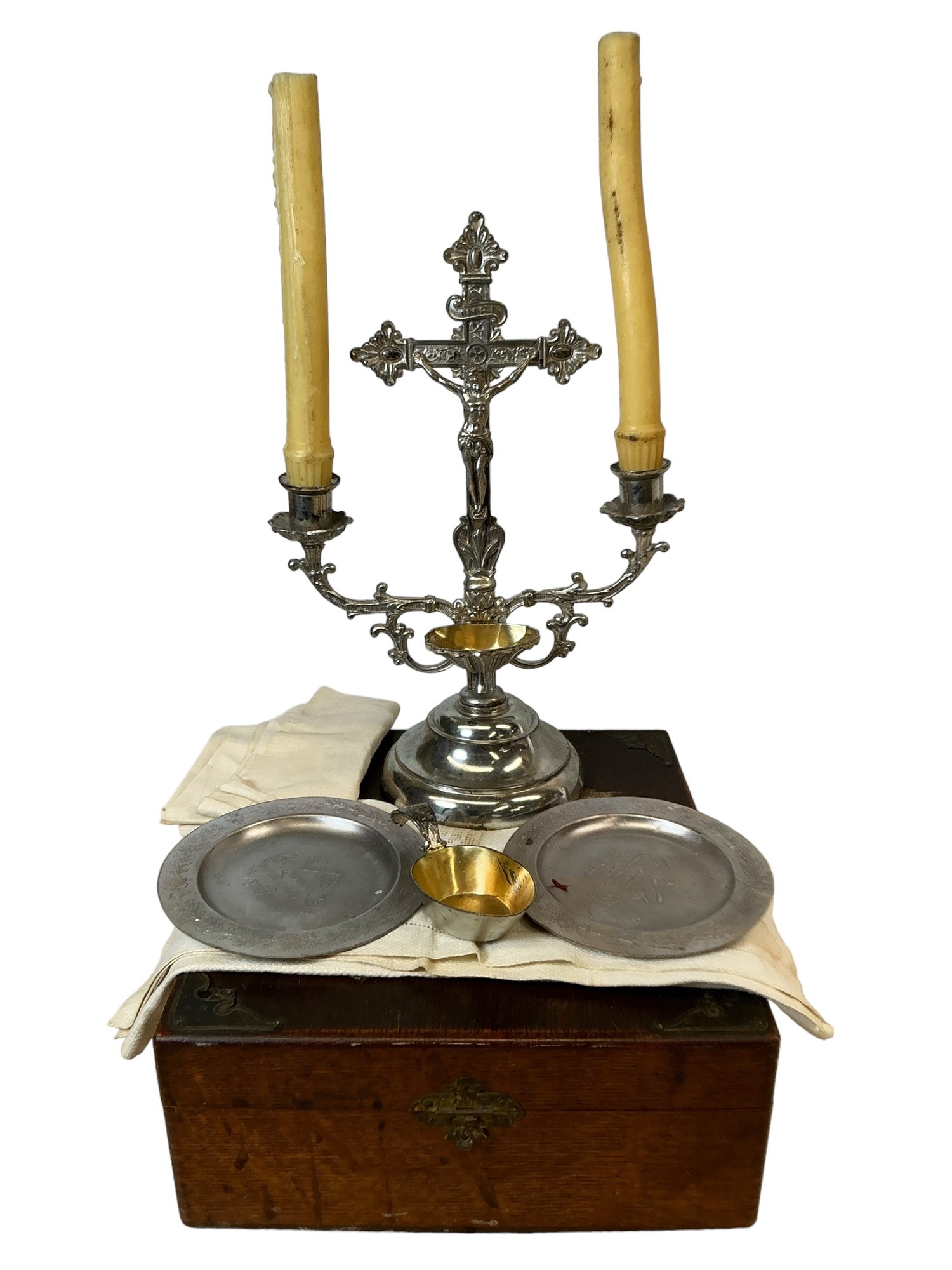 Antique Or Vintage Catholic Last Rites Set In Oak Box Complete. In good used condition with minor wear and some stains to the top of the case, please see photos. The box itself is approx. 11.5” by 10.5” by 4.5”.