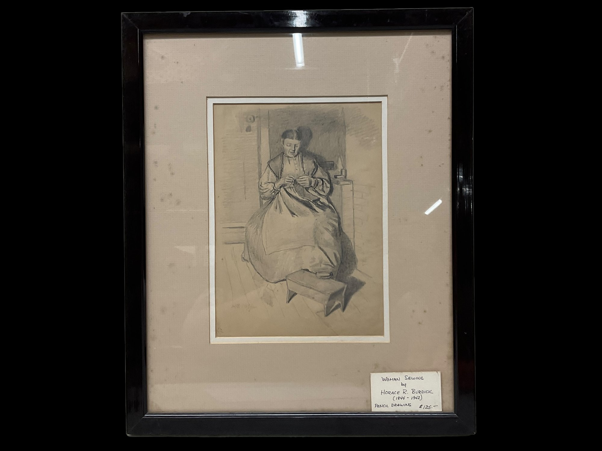 Antique Pencil Sketch Of Woman Sewing By Horace Burdick, signed in lower left by the artist. Sight size measures 10” x 7,” measures 18” x 14” including the frame.
