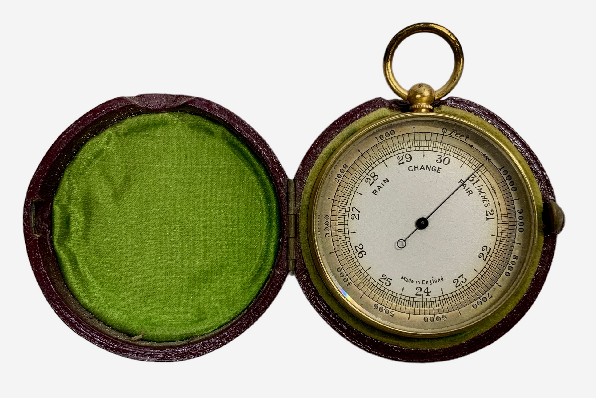 Antique Pocket Barometer Made In England In Leather Carrying Case. In good condition. It is approx. 2.5” tall.
