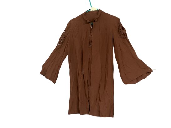 Antique Silk? Bell Sleeve Brown Open Tunic Intricate Decoration, Open front with a very sweet little closure at the top. Measures approximately 20” across at bust, and throughout the flat measurement, pit to pit.