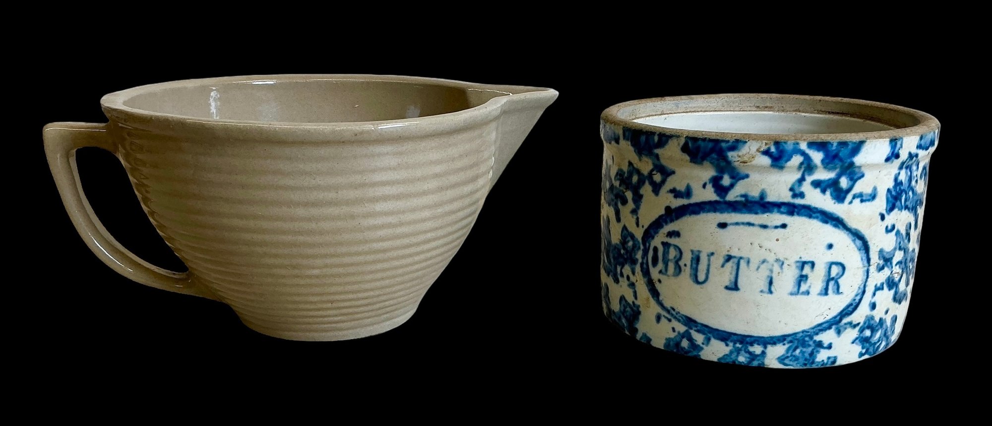 Antique Spongeware Butter Crock And Yellowware Type Batter Bowl. Both in good used condition. The butter crock is approx. 6.5” in diameter.