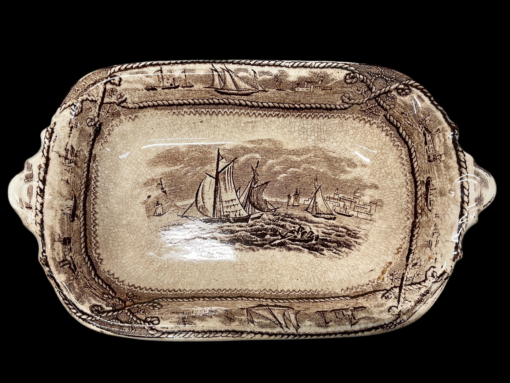 Antique Stoneware Transferware Side Dish Nautical Ship Motif, measures 8” wide, no chips or cracks, some general wear and crazing.