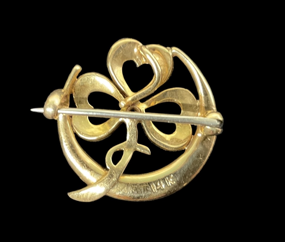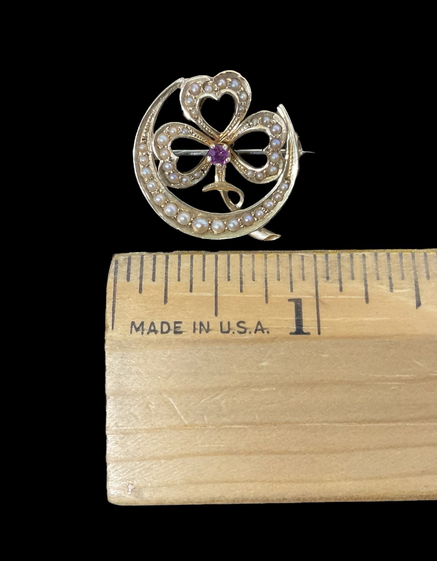 Antique Victorian Crescent Moon And Clover 14K Yellow Gold Seed Pearl And Ruby Brooch In very good condition. It weighs approx. 2.1 DWT. It is approx. 0.75” wide.