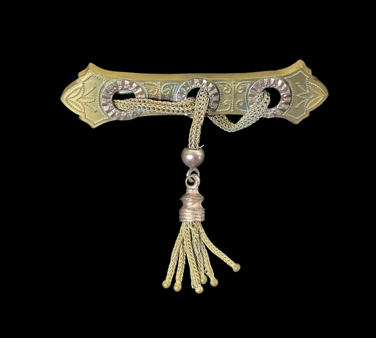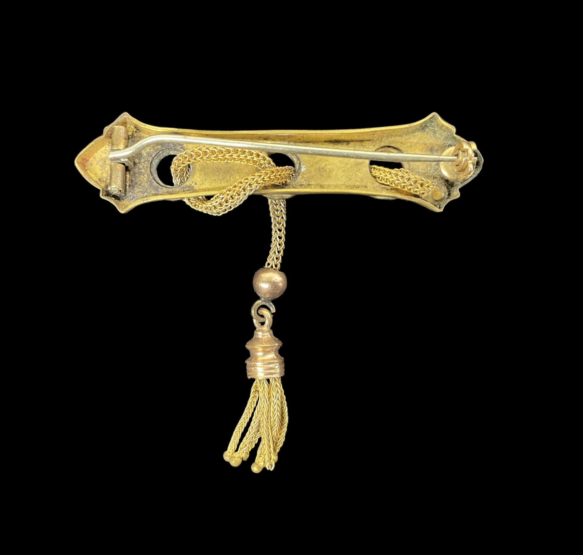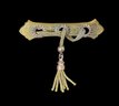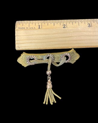 Antique Victorian Gold Gilt plated? Braided Tassel Brooch. In good condition. It is approx. 2.5” long.