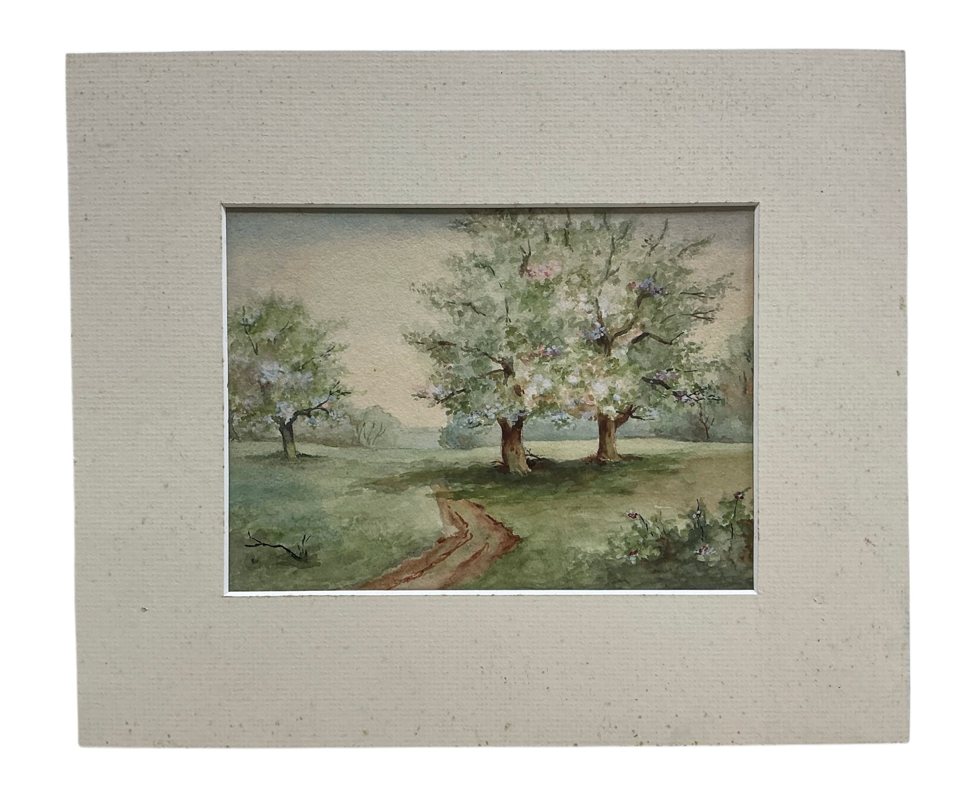 Antique Watercolor Of Flowering Trees Unsigned. In good condition. It is watercolor on paper that has been laid onto board. Sight size is approx. 7” by 9.5” and mat size is approx. 10” by 12.”