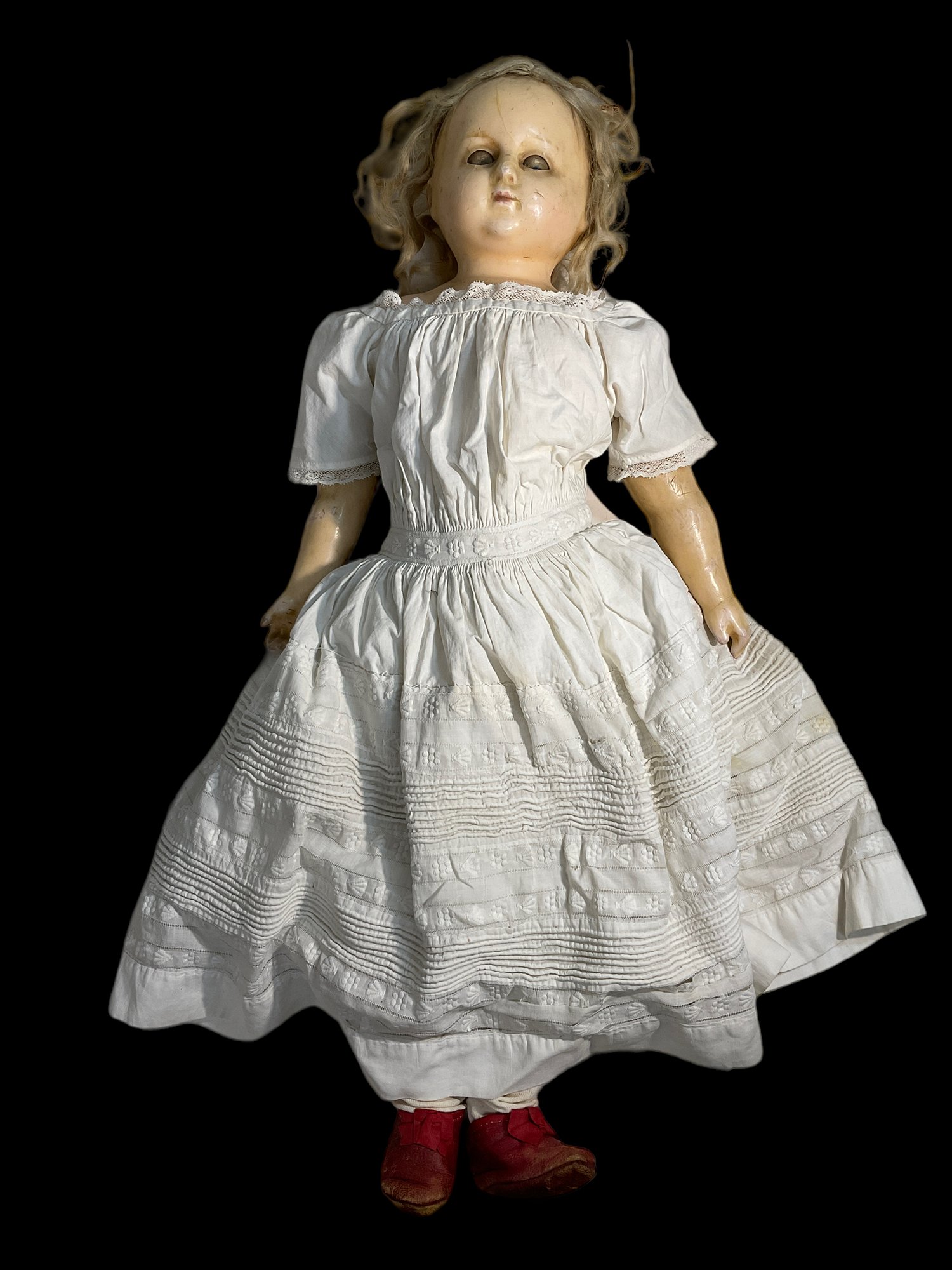 Antique Doll With Red Shoes. Composition head with wax. Has some wear to head and body. 22”.