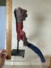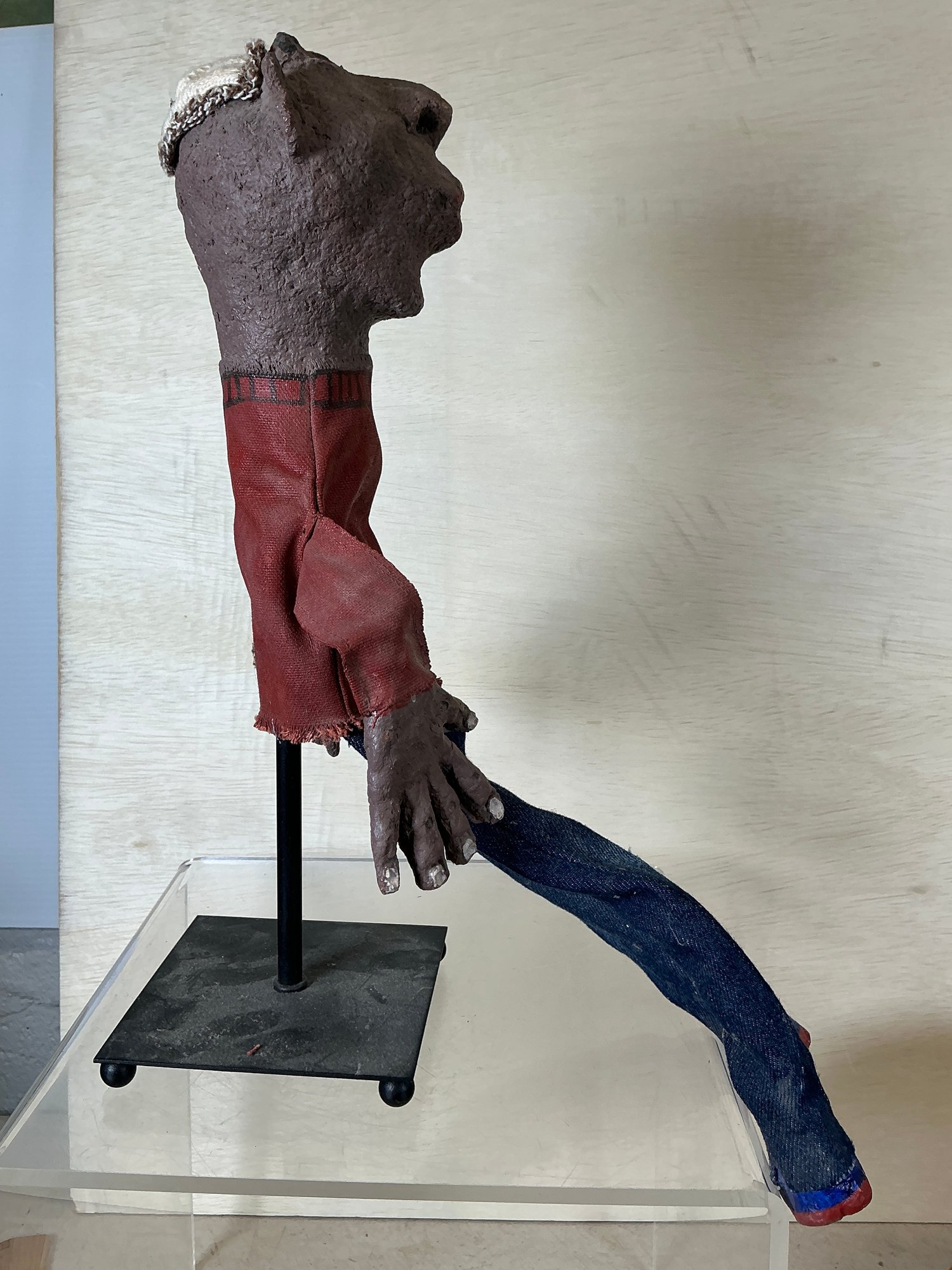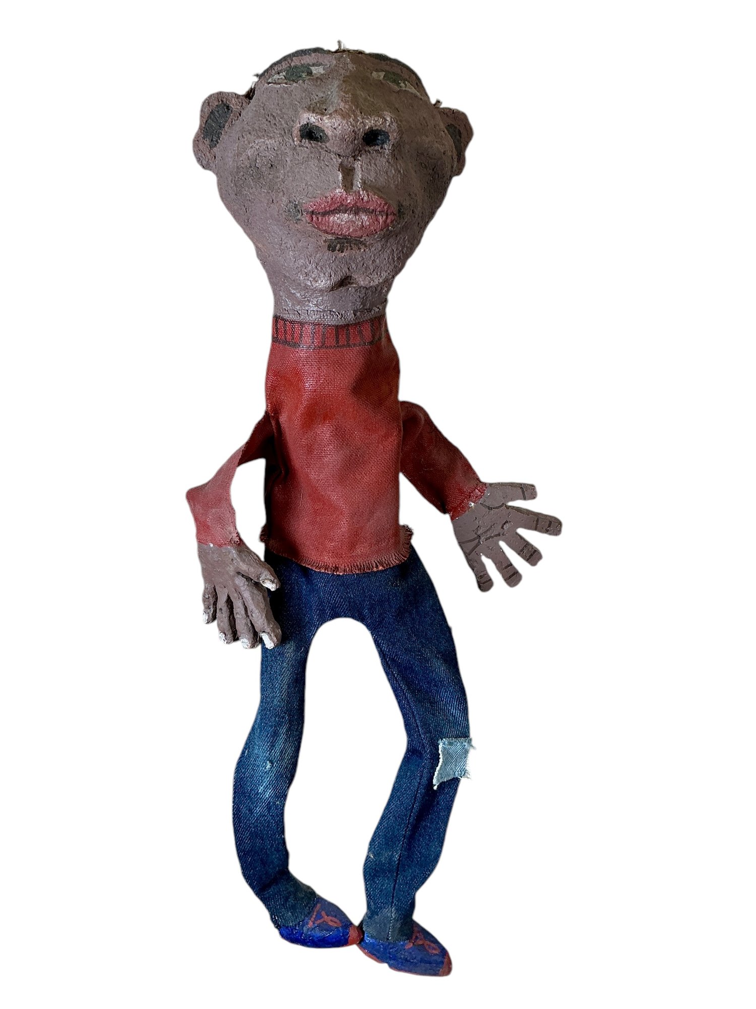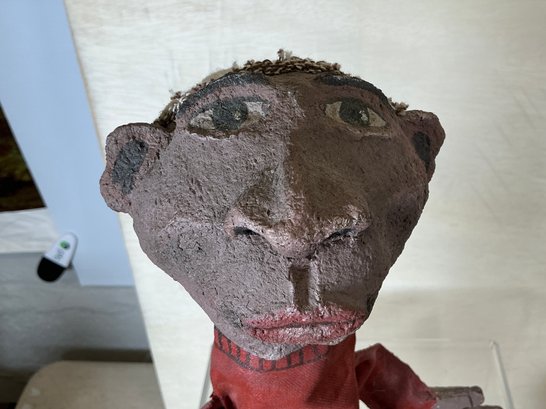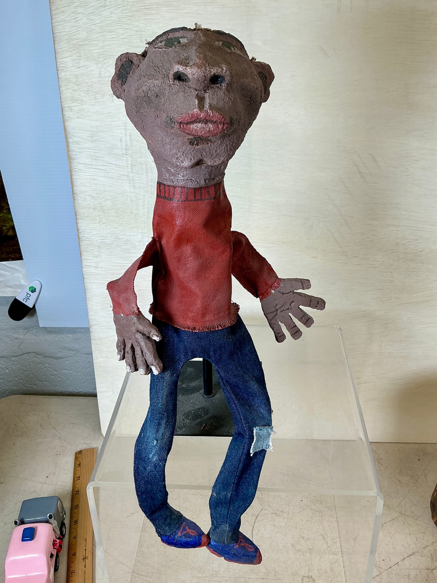 Paper Mache Puppet Man In Jeans And Small Beanie, 18” tall, see photos for condition.