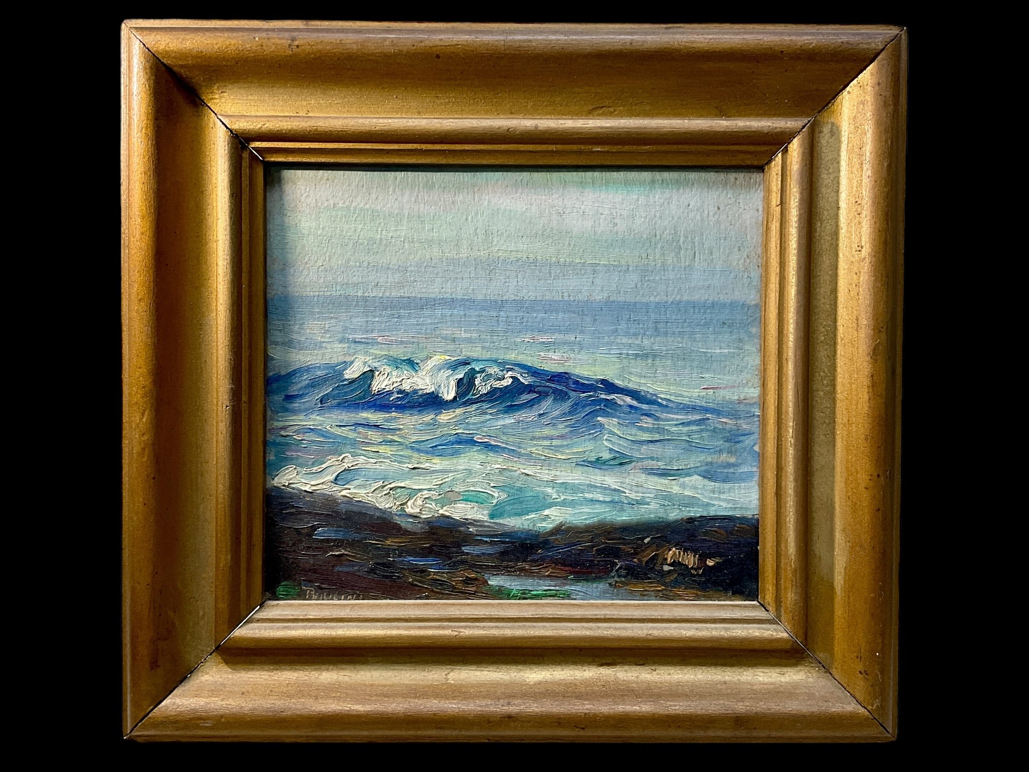 Parker Perkins Oil Painting On Board Seascape, measures 7” x 7.5.” There are a few places where small flecks of paint are missing, see photos. Because the board it is painted on is grey, they do not stand out the way missing flecks often do. This painting would benefit from a professional cleaning.