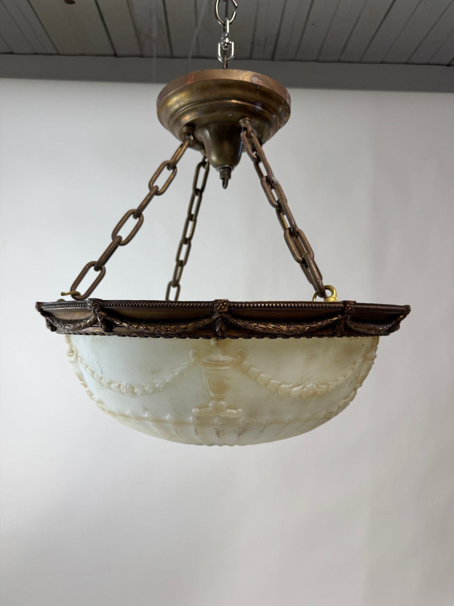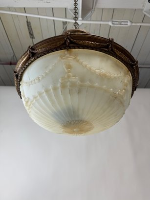 Art Deco Grecian Style Hanging Lamp Shade in very good condition. It has a sort of Grecian band and embossment on the glass bowl.