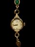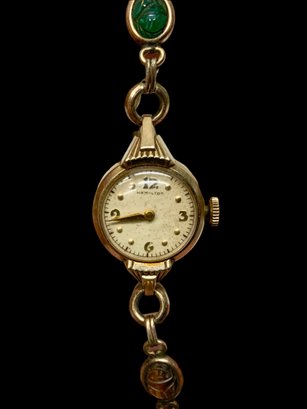 Art Deco Hamilton 10K Lady’s Antique Watch, with scarab colorful stone watch band. This winds and is ticking, not timed for accuracy but currently running. Some small damage/ scratches in the glass but no deep scratches. Watch band is gold plate.