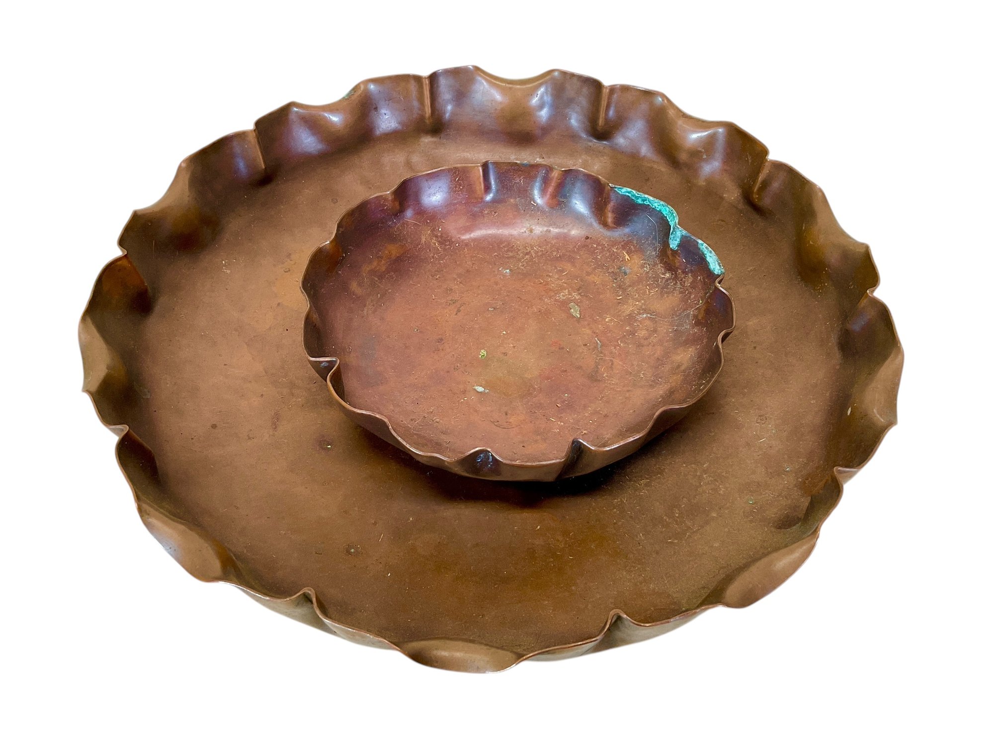 Arts And Crafts Copper Trays Signed Tait Martha’s Vineyard, large bowl/tray is 10.5” wide, smaller is 6” wide. Both signed on bottom, “Tait.”