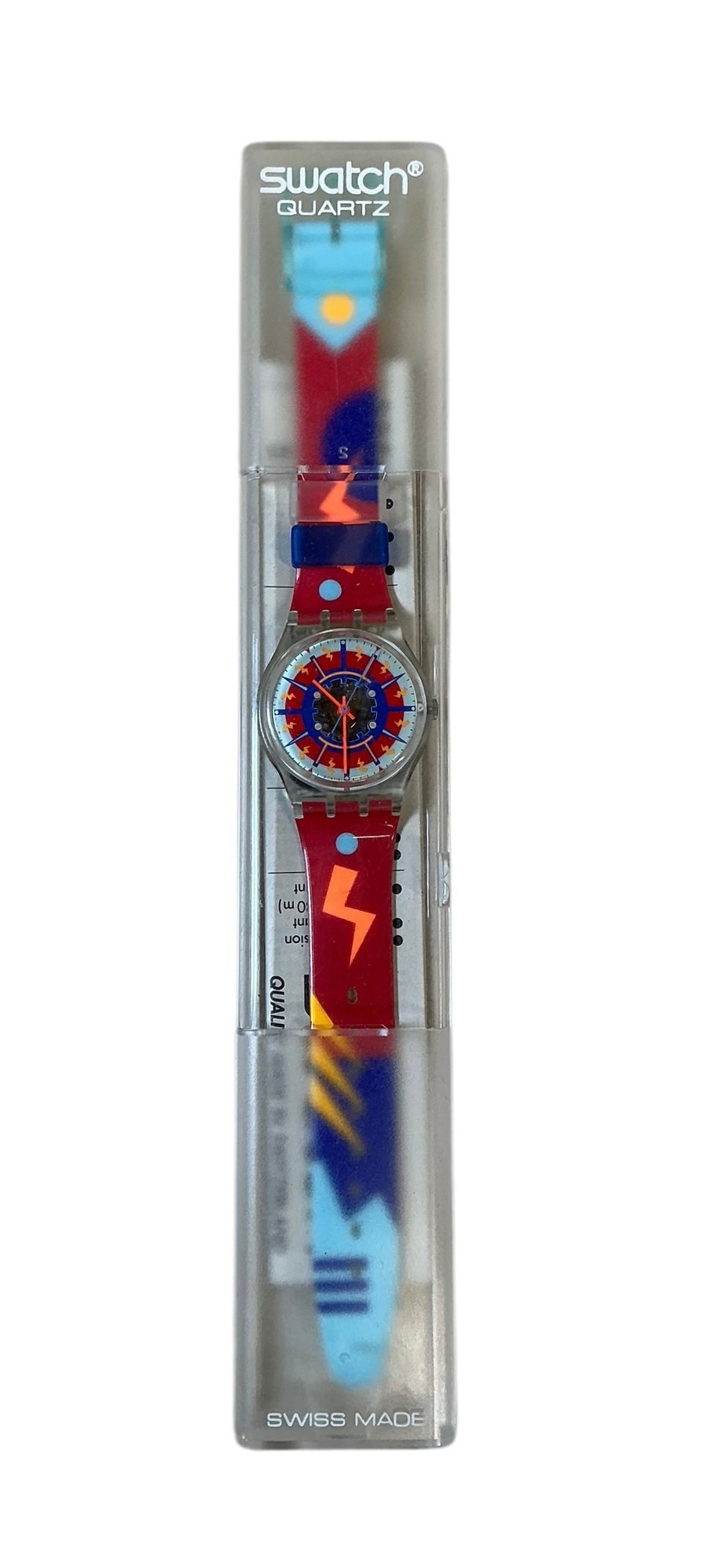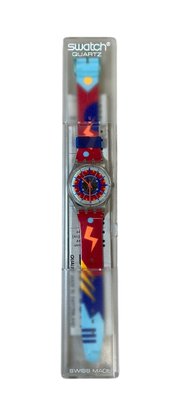 NIB 90s Swatch Quartz Watch. In good condition. Crown and hands move freely when set but it is not tested with a battery and not currently running. Case is approx. 9.25” long.