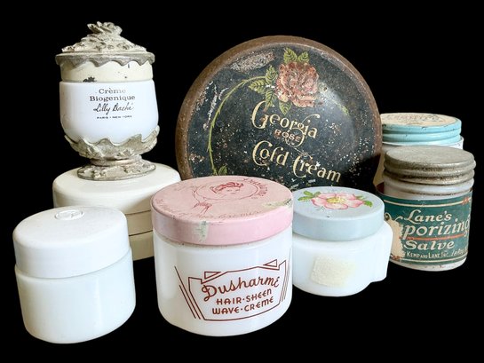 Batch Of Antique And Vintage Containers Beauty Cream Etc, see photos for condition, the Dusharme Hair Sheen Wave Cream is still partly full. These have surface wear, but none of them have chips or cracks.