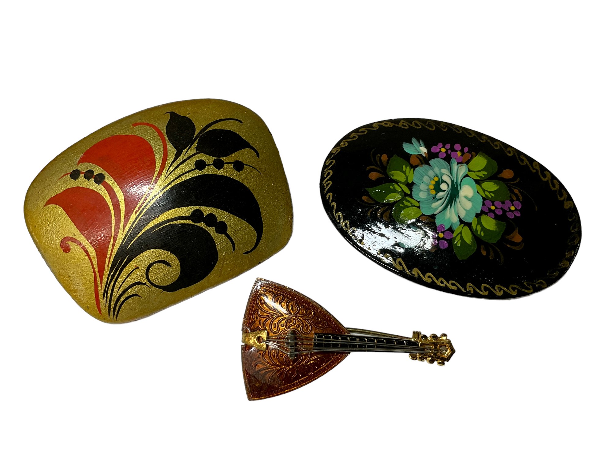Batch of Pins with Painted Russian Balilaka, largest is 2.25 inches wide.