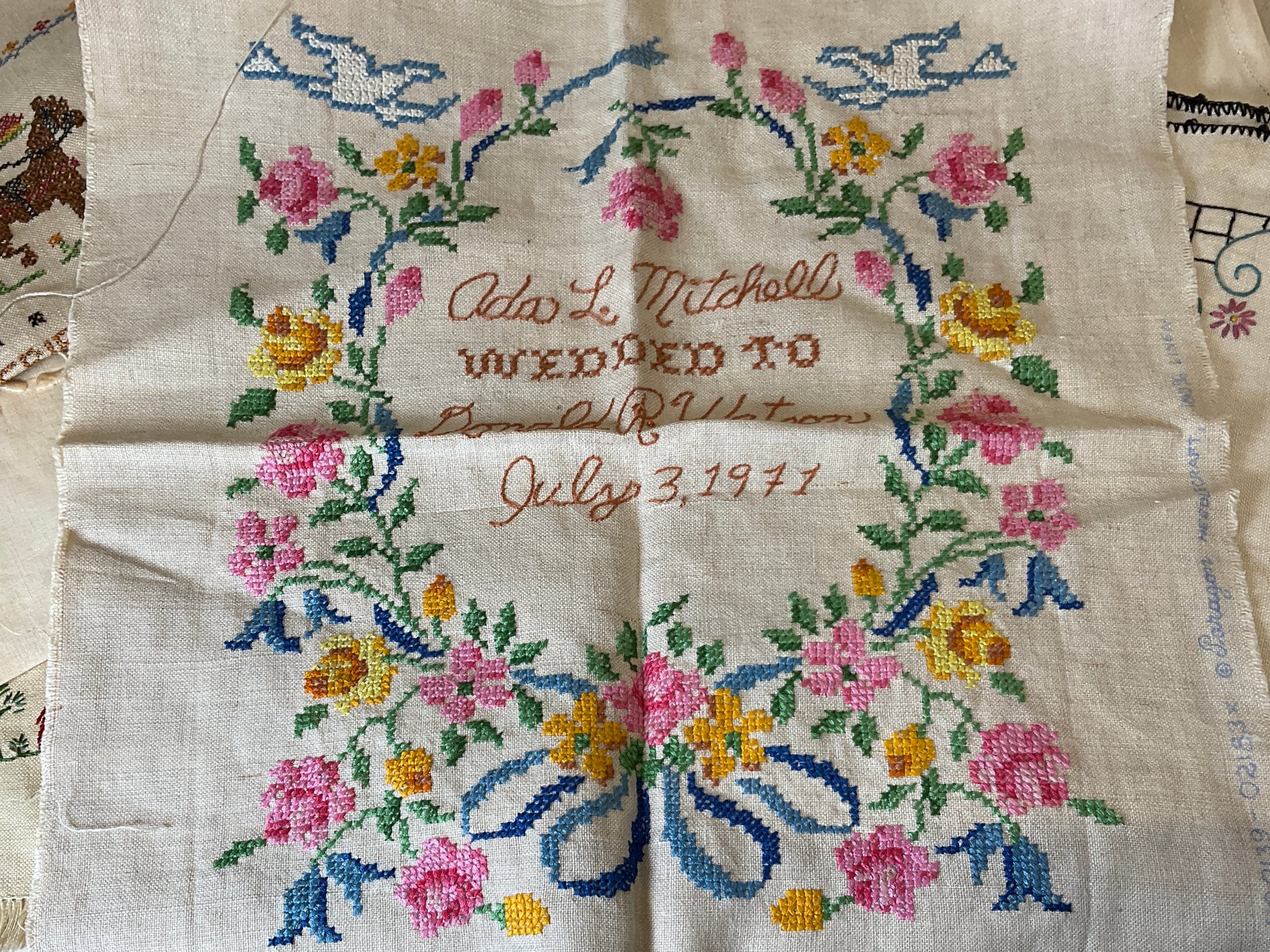 Big Batch Of Folksy Embroidered Items, antique and vintage, cross stitch, embroidery, etc, some with unfinished edges, see photos.