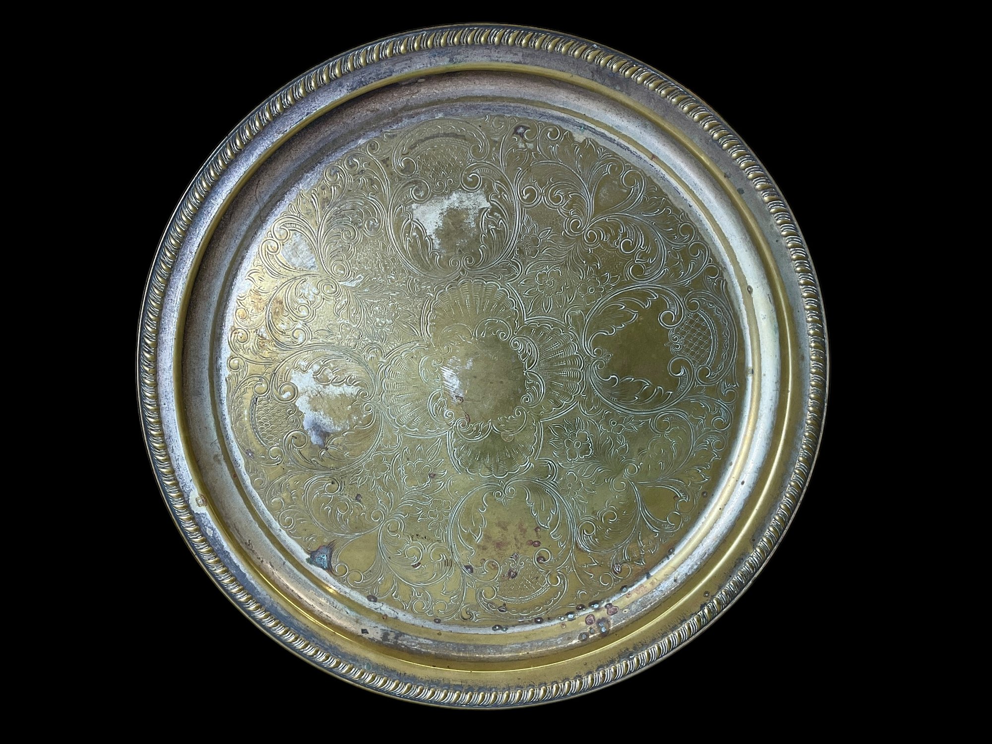 Big Vintage Metal Tray Ornate Design, measures 13” in diameter, has a nice look with the patina/wear.