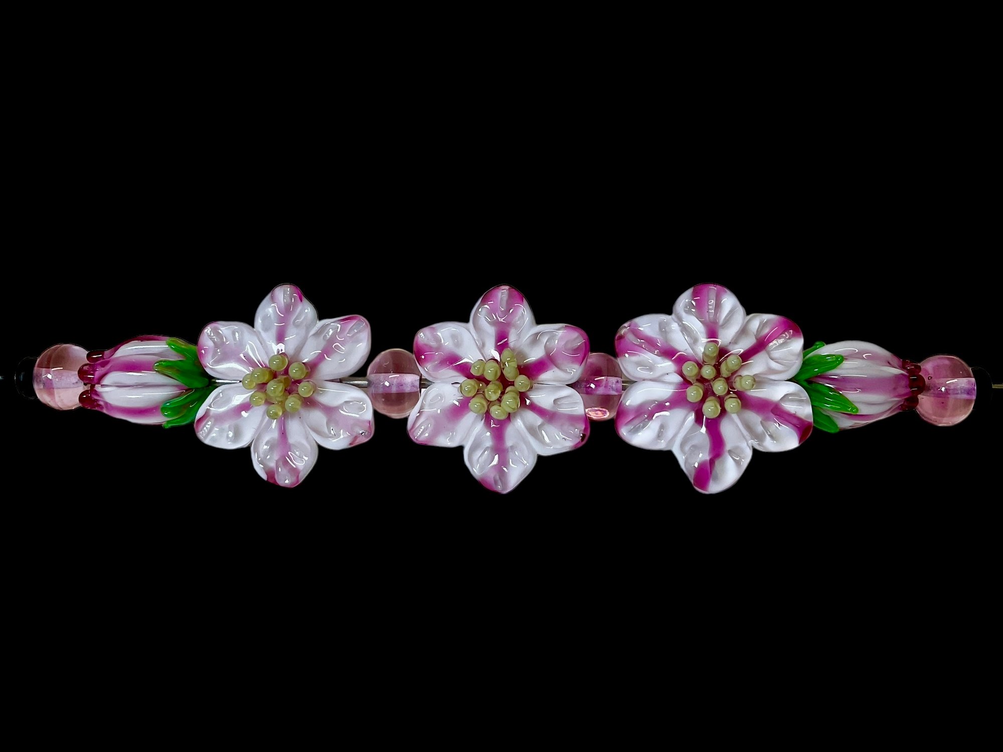 Blown Glass Flower Bead Set Lamp Work Artisan Made, three 1.25 flower beads and two .75 flower bud beads.