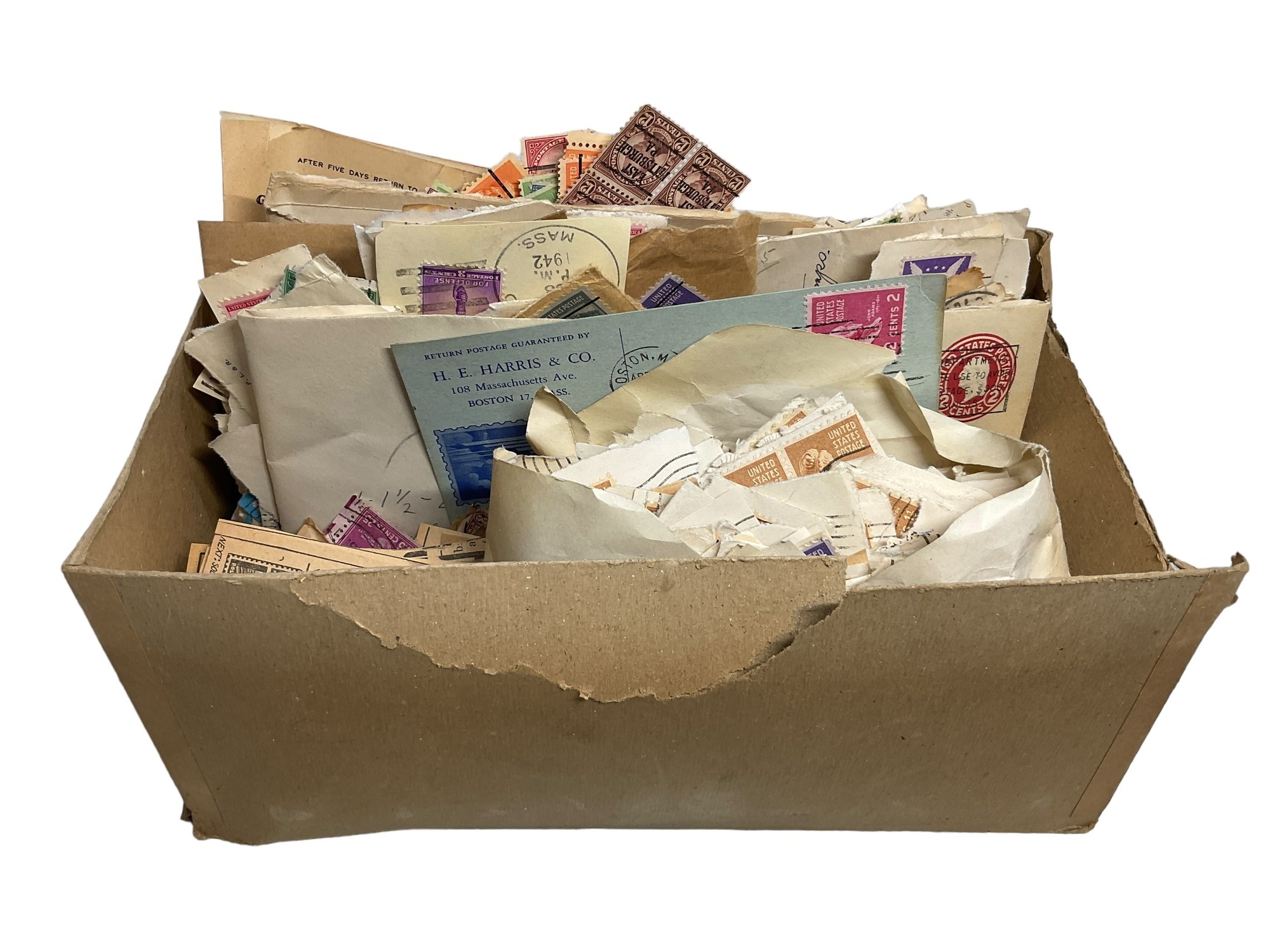 Box Filled With 1930s 40s 50s And Other Stamps 8 Cents 20 Cents Washington Etc. All are used and in fair to good condition, please see photos. The box is 9.75” by 5.5” by 4.25” tall.