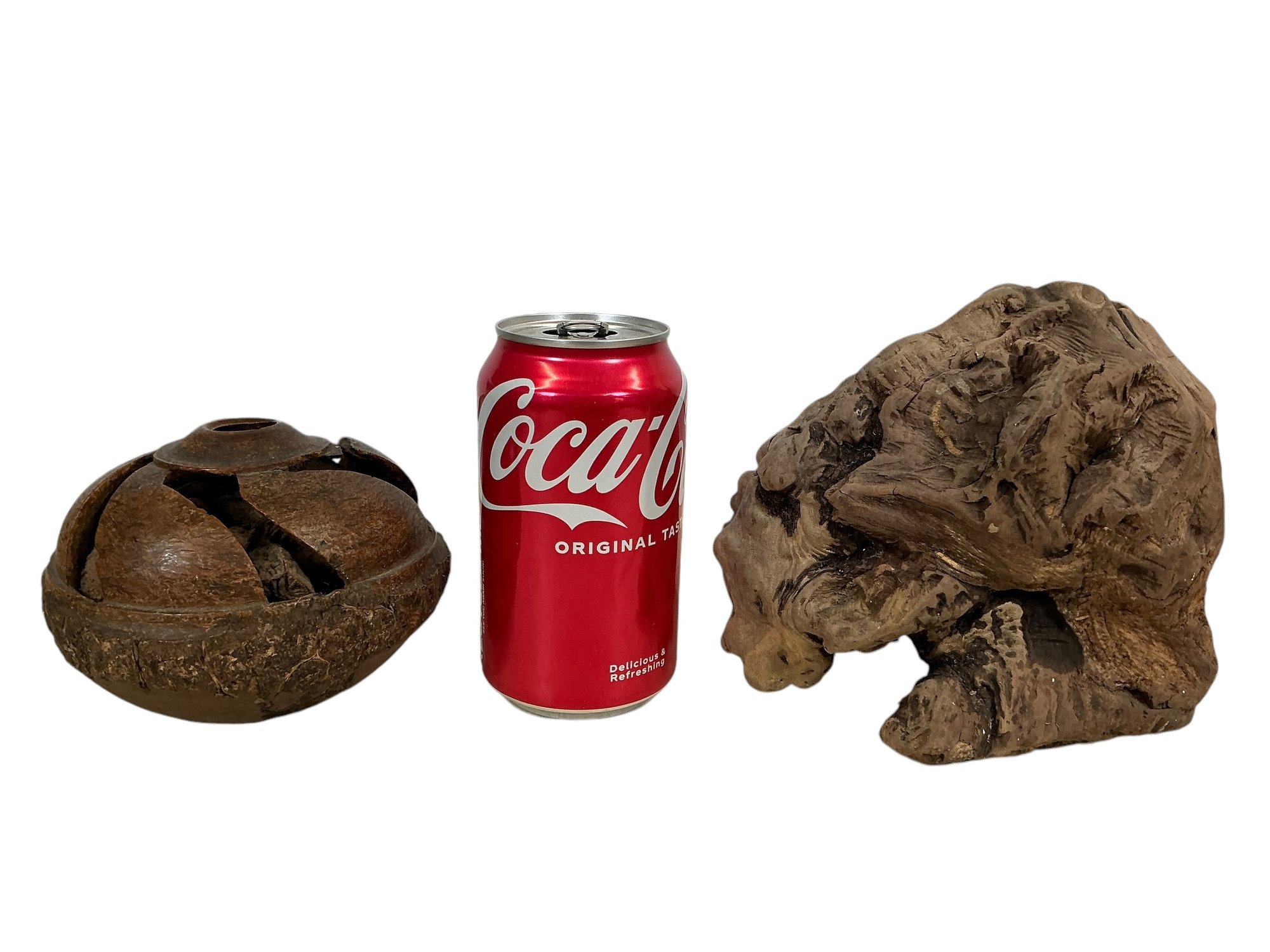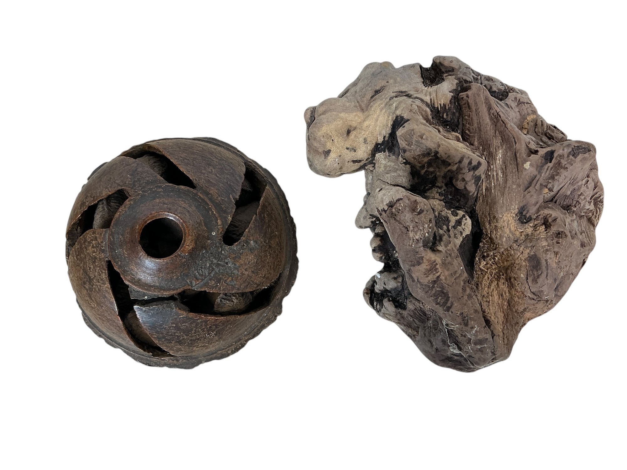 Carved Brazil Nut Pod And Wood Burl. In good condition but the Brazil nut pod has a split, please see photos. The largest is approx. 5.5” tall.