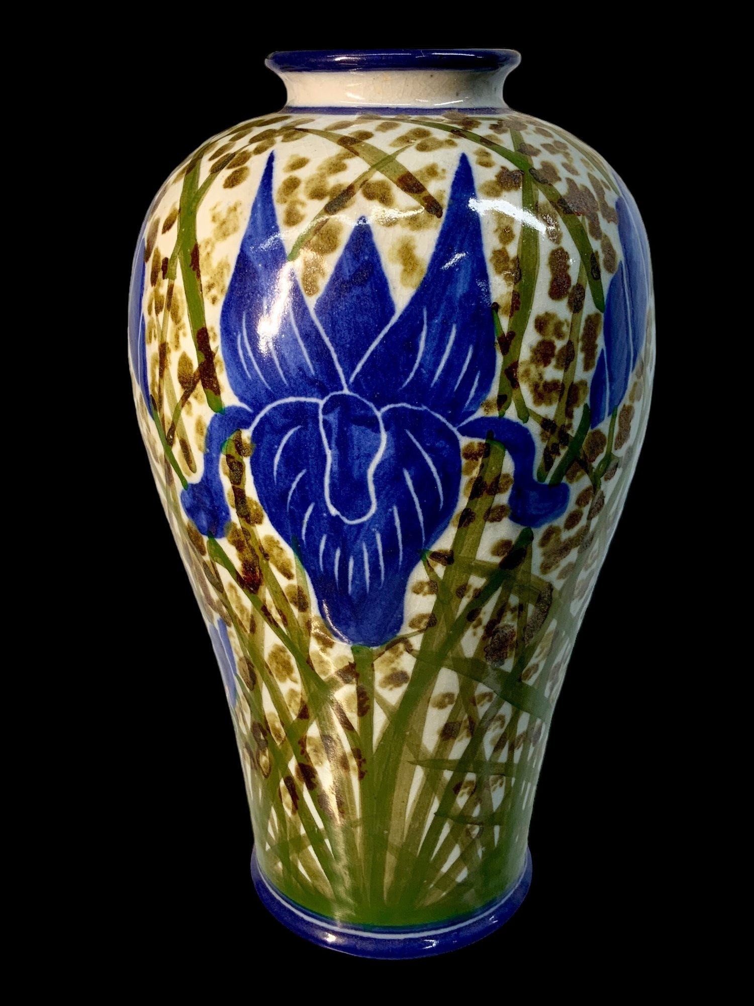 Cassis Blue Iris Pottery Vase, measures 11” tall, no damage. Signed on the bottom.