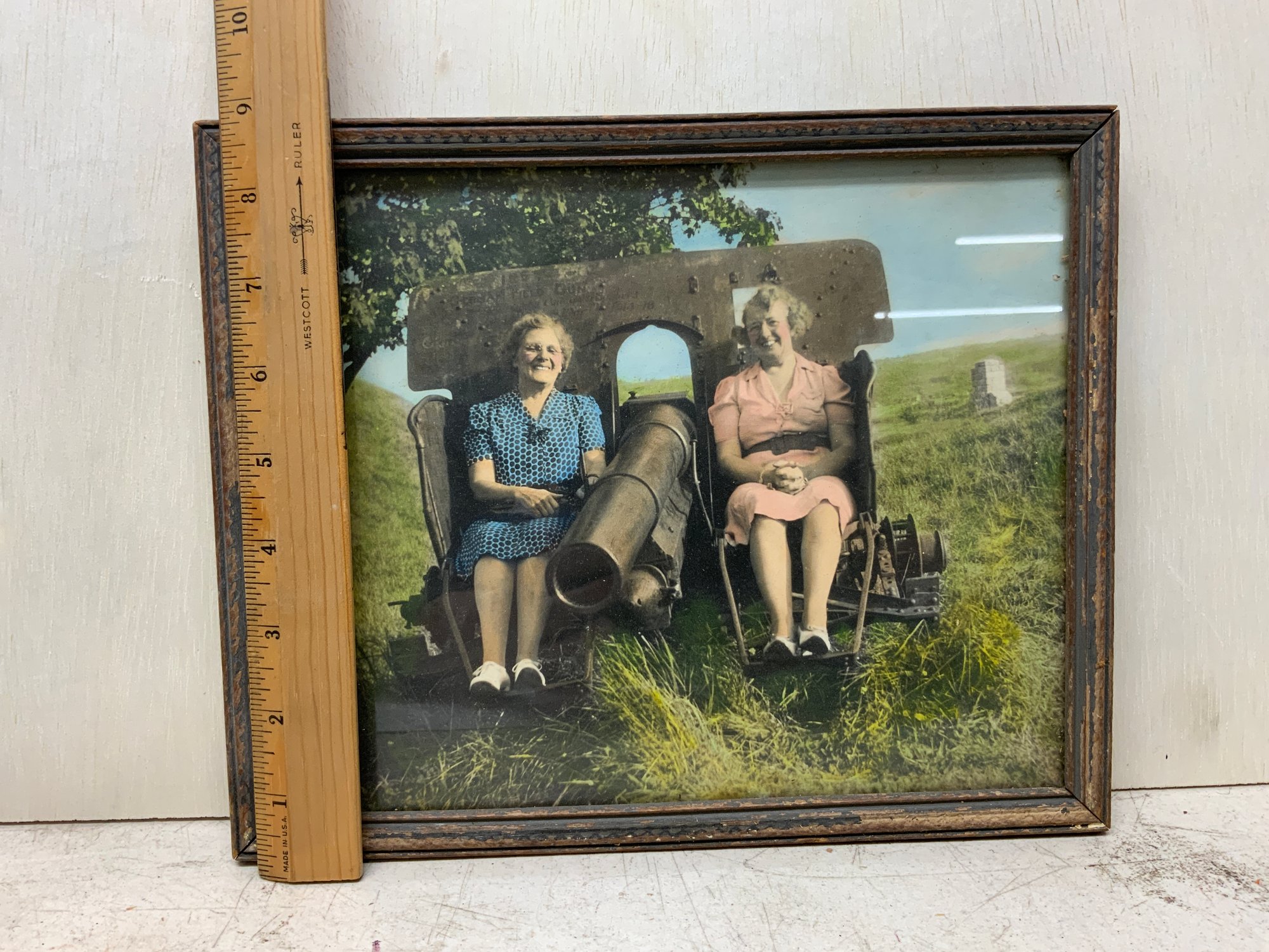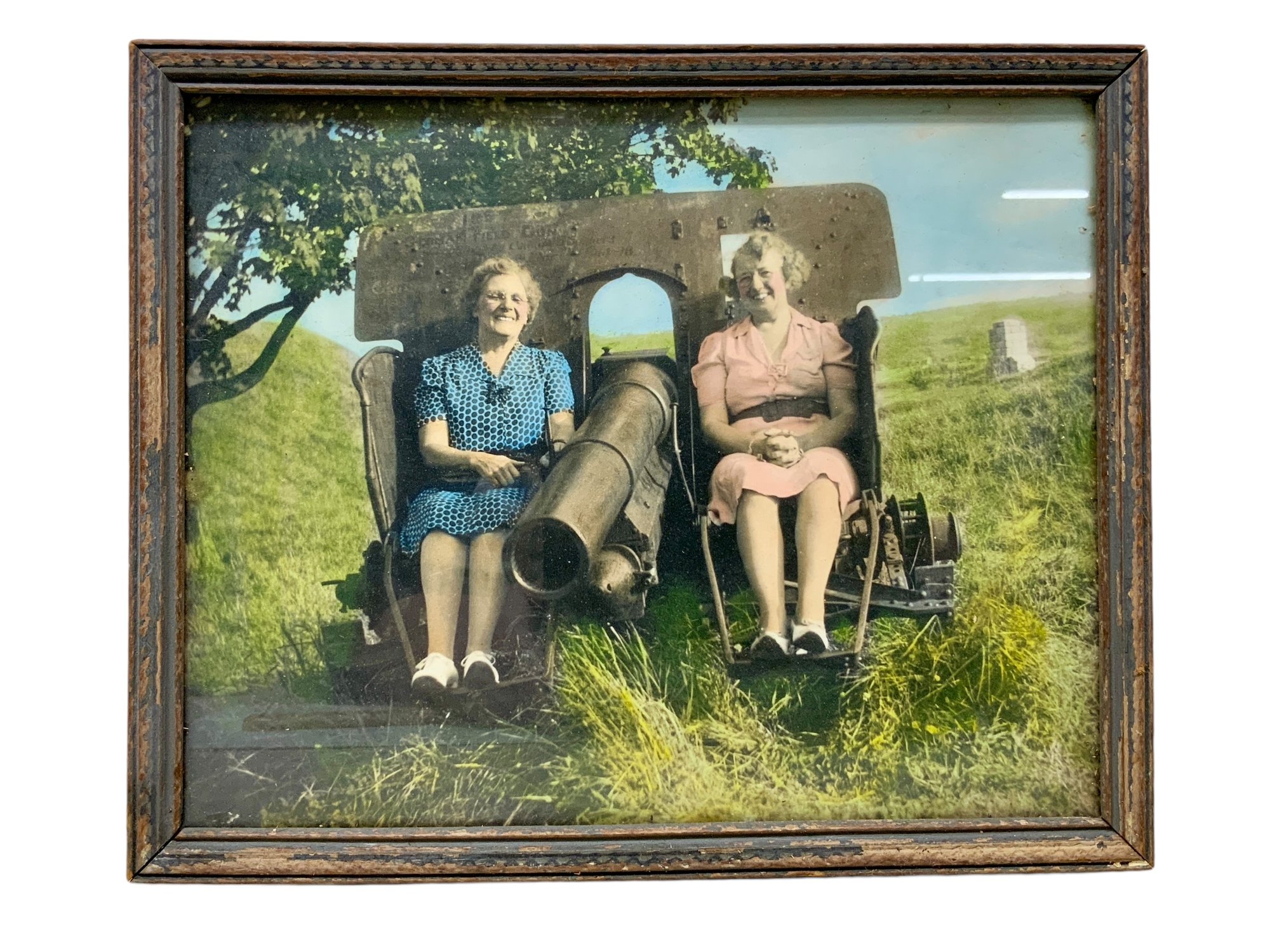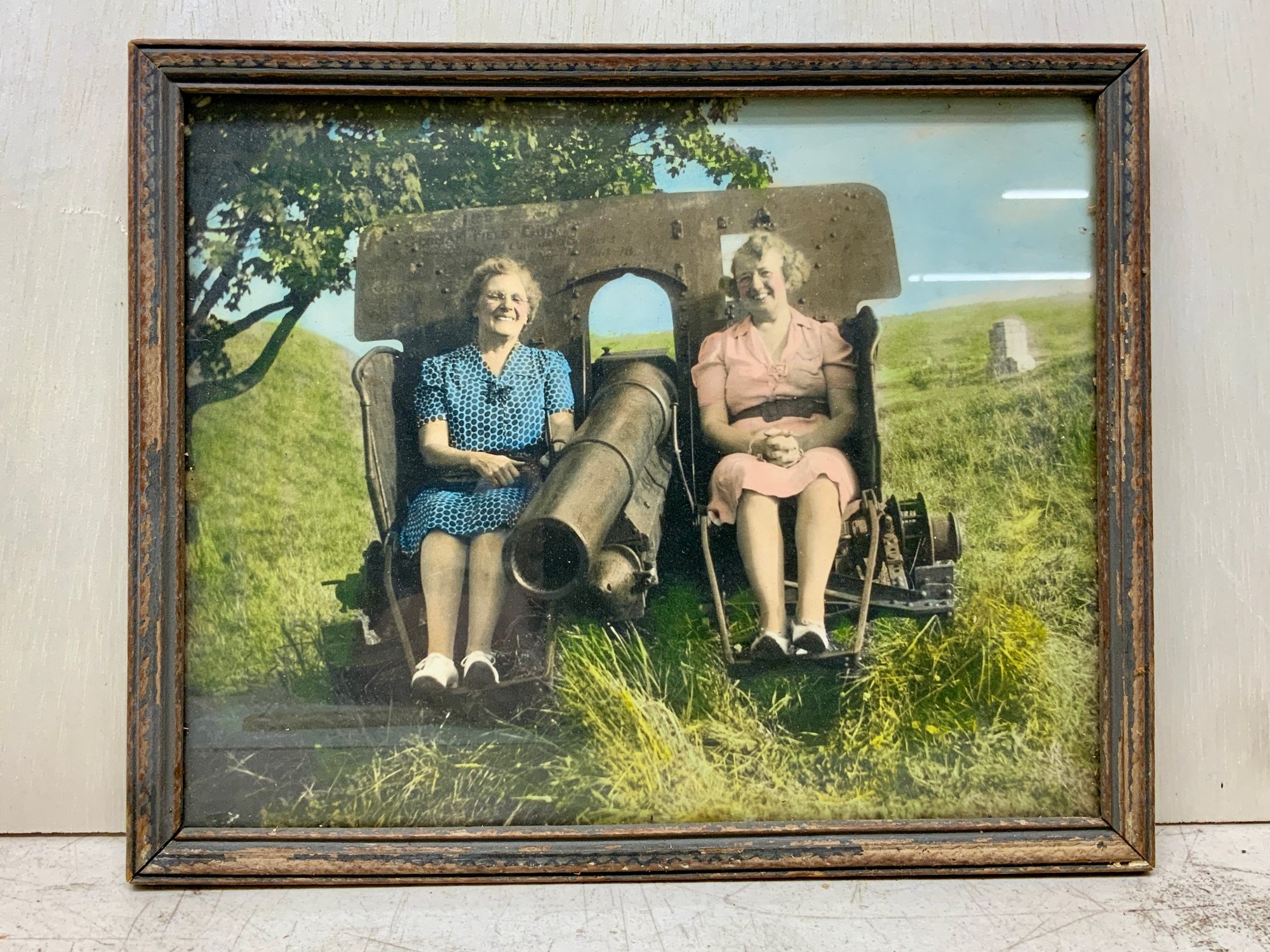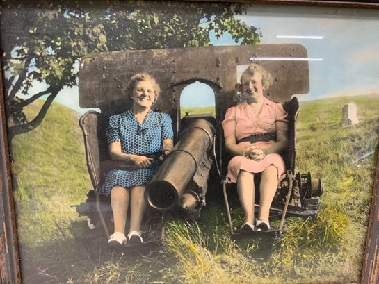 Colorized Antique Photo Of Two Elder Ladies Sitting On A Cannon, measures 8” x 11.”
