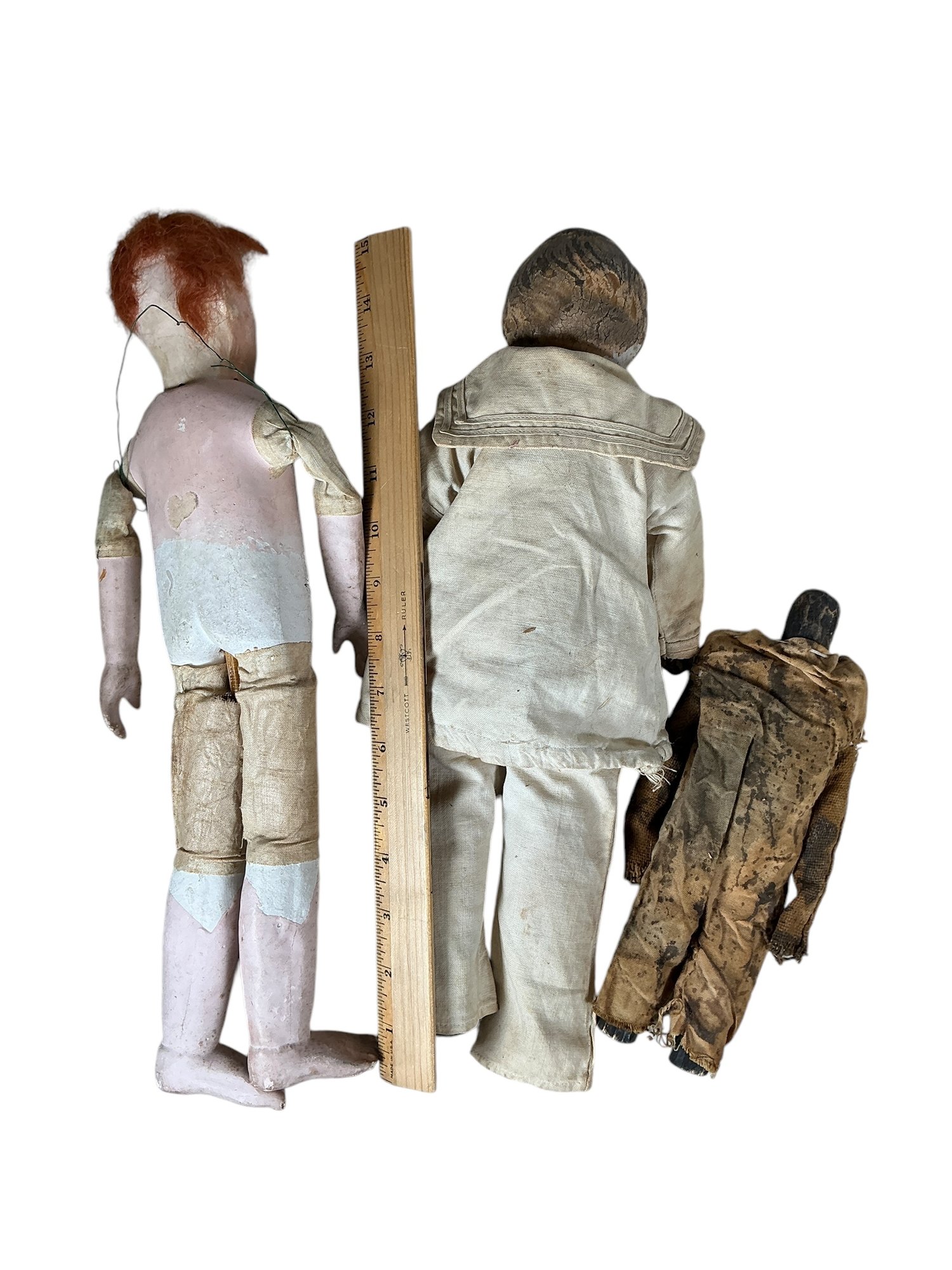 Creepy Vintage Distressed Doll Lot. In fair to good condition, the doll with the red hair has a semi detached leg, please see photos. Tallest is approx. 15."