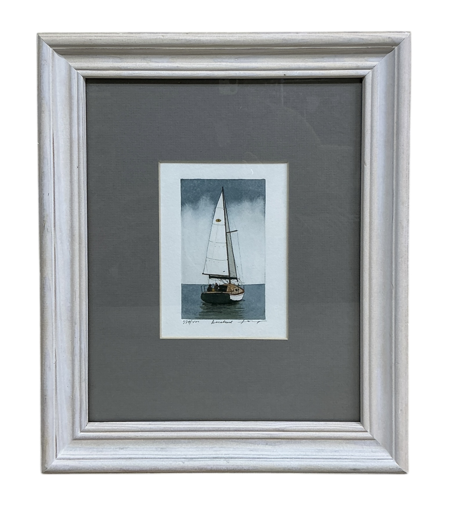 Indistinctly Signed Color Etching Of Sailboat. In very good condition. Sight size is approx. 5” by 3.5” and the frame size is approx. 10.”