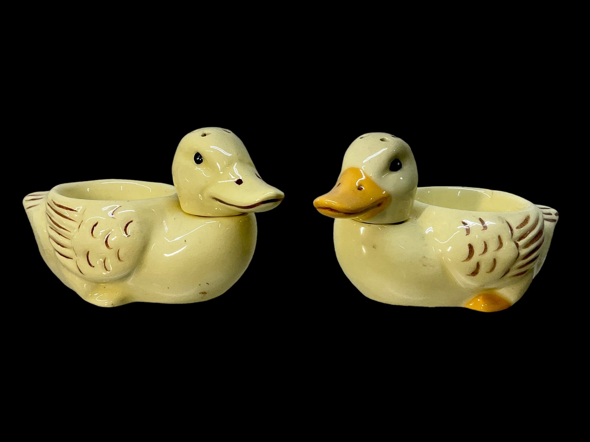 Duck Egg Cups With Salt And Pepper Shaker Heads, ceramic, signed Nancy Curley 1966. These have a little bit of a hairline in the glaze on one, see photos.