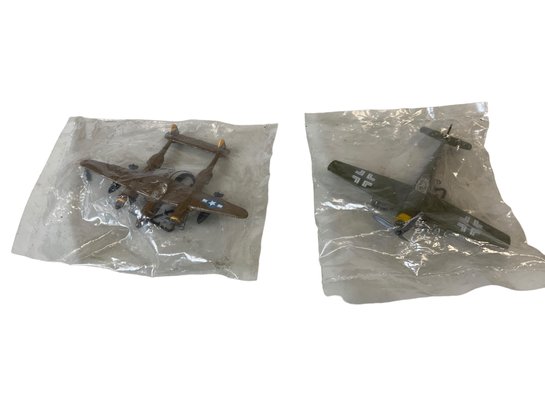 Dyna Flites Two Die Cast Airplanes 108E Messerschmidt And P-38 Lightning. The P-38 has broken propellors but the Messerschmidt is in good condition, please see photos. Each has a wingspan of approx. 4”.