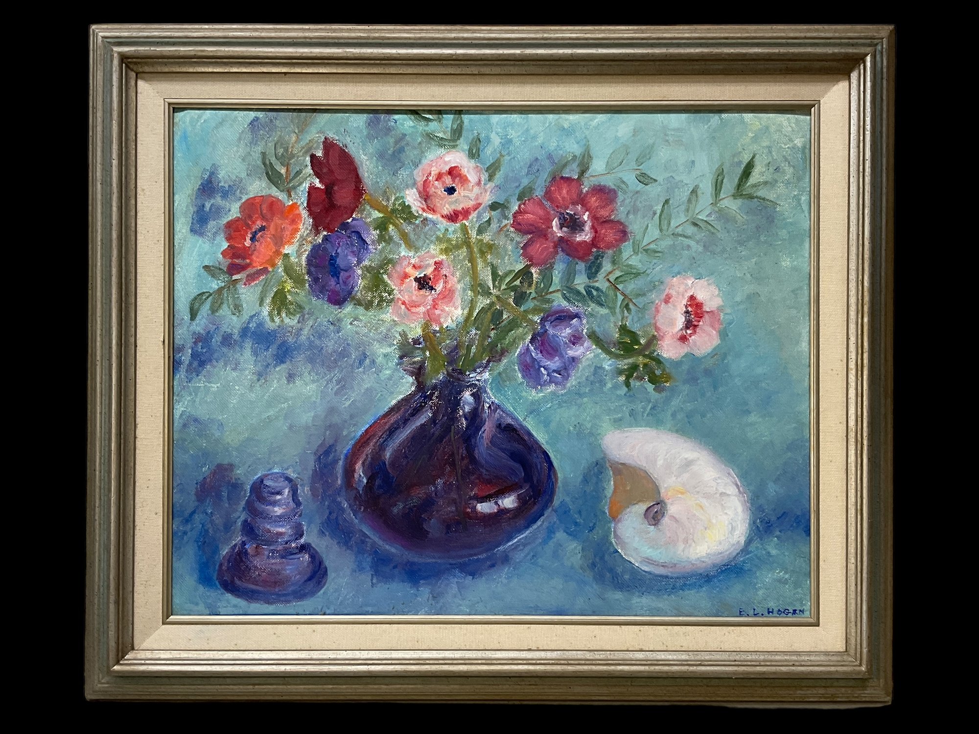 EL Hogan Still Life with shell Oil Painting On Canvas, measures 16” x 20.” Signed by artist in lower right.