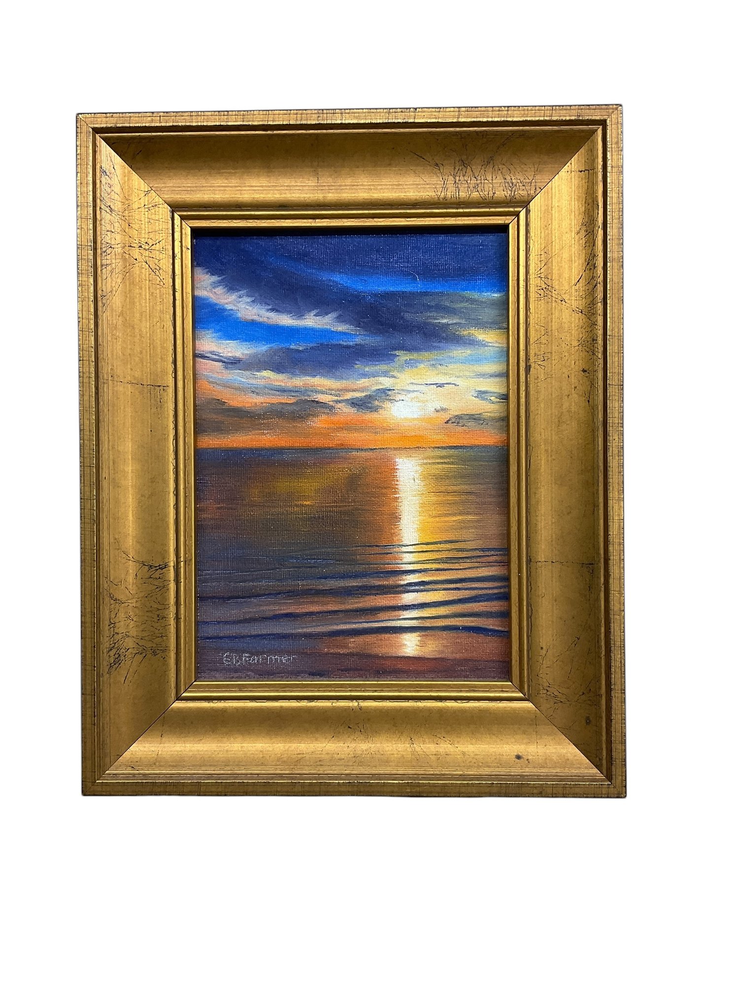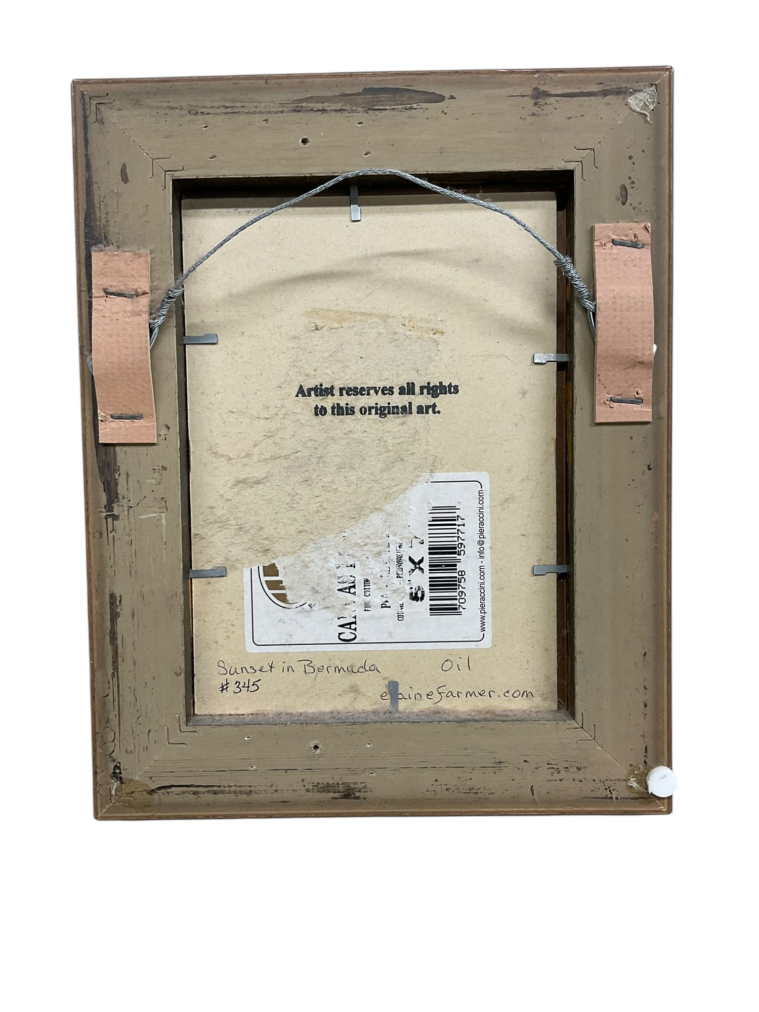 Elaine Farmer NH Artist Oil On Board Sunset In Bermuda. Good condition. Sight size is 5” by 7” and frame size is 9.75” by 7.75”.