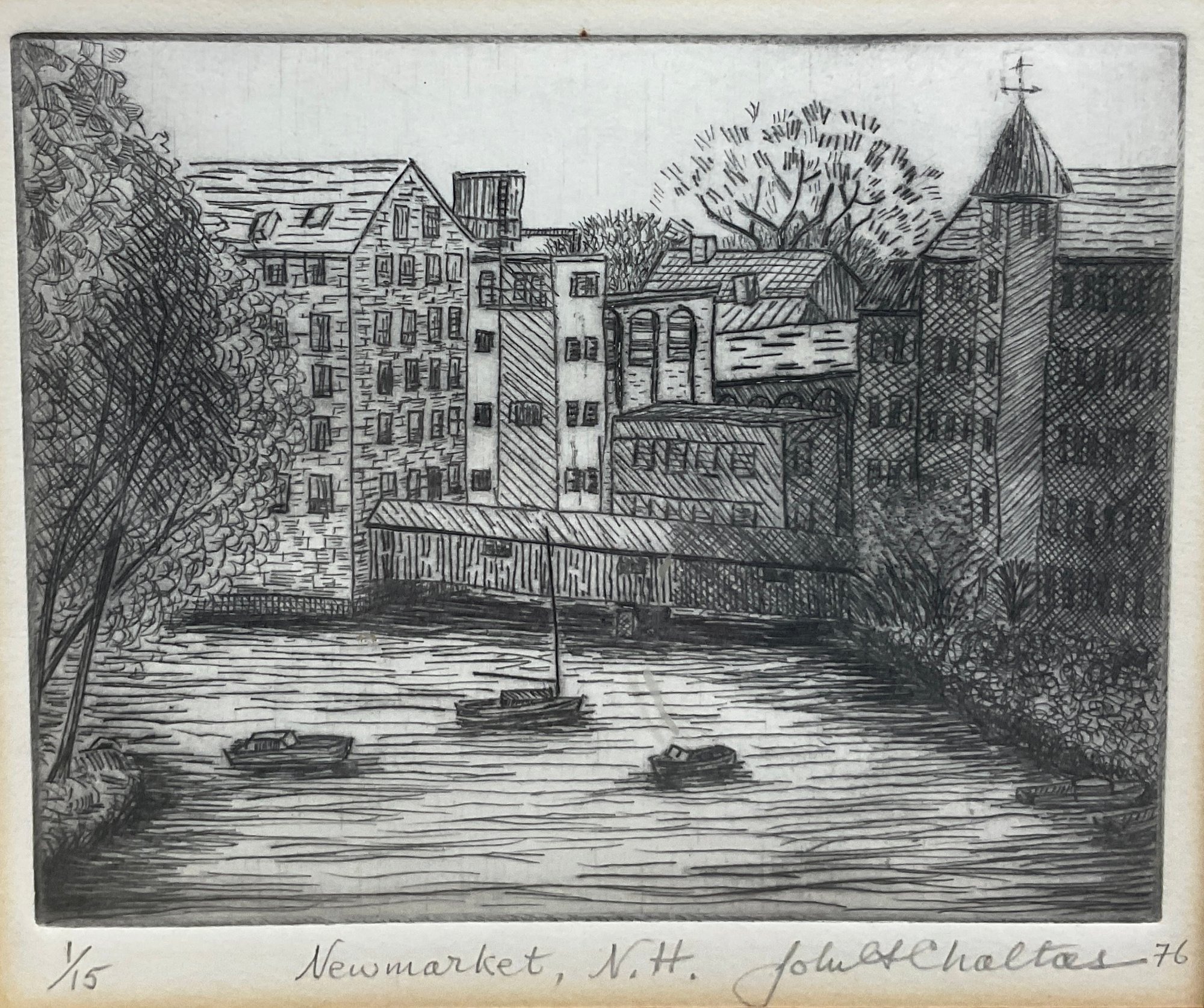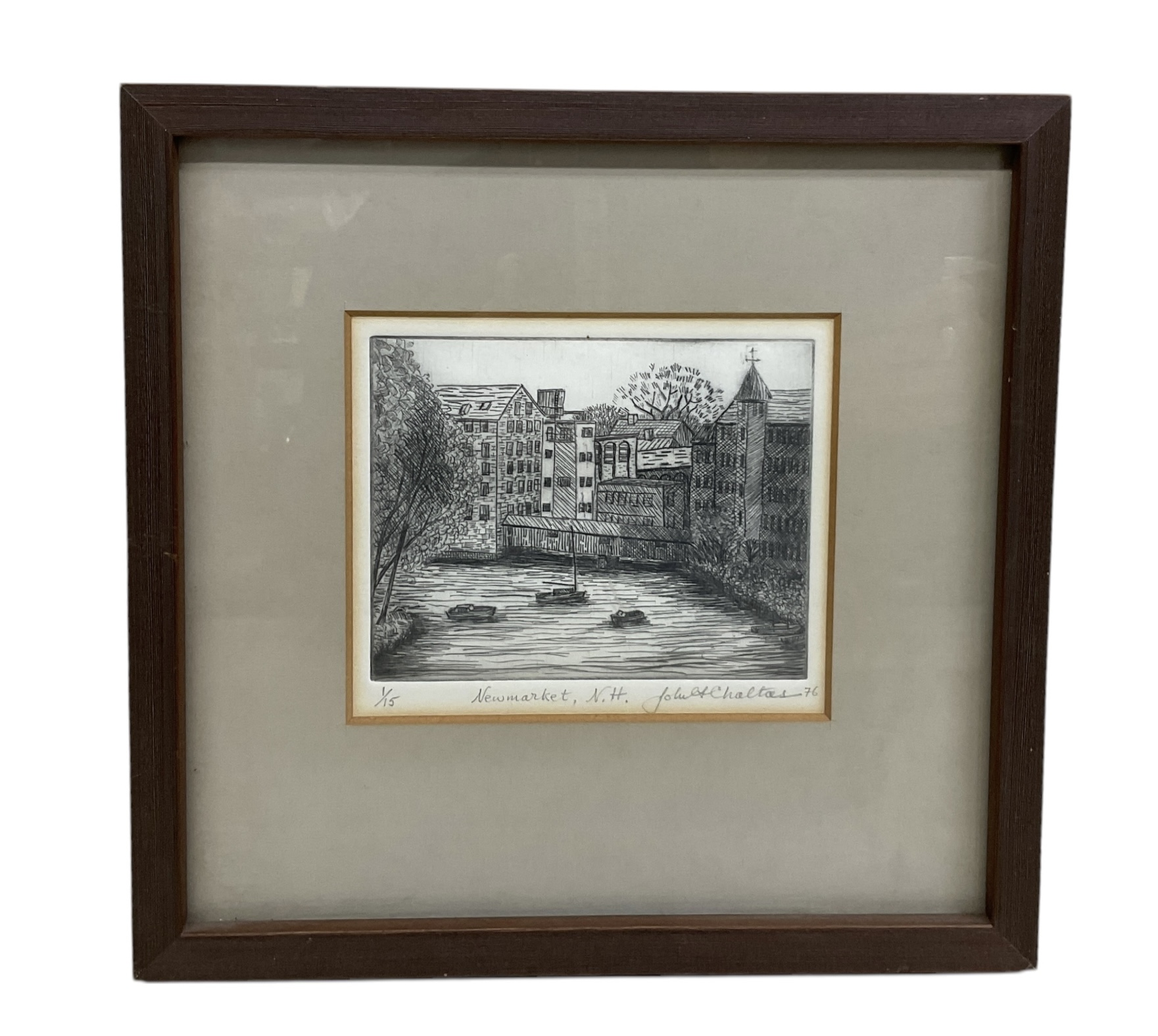 Etching Of Newmarket NH By John S Chaltas. In good condition. Sight size is approx. 4.5” by 5.5” and frame size is approx. 10” square.