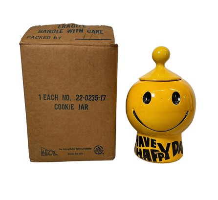 New In Box 1970s Happy Face McCoy Pottery Cookie Jar Have A Happy Day. In very good condition. The jar itself is approx. 11” tall.