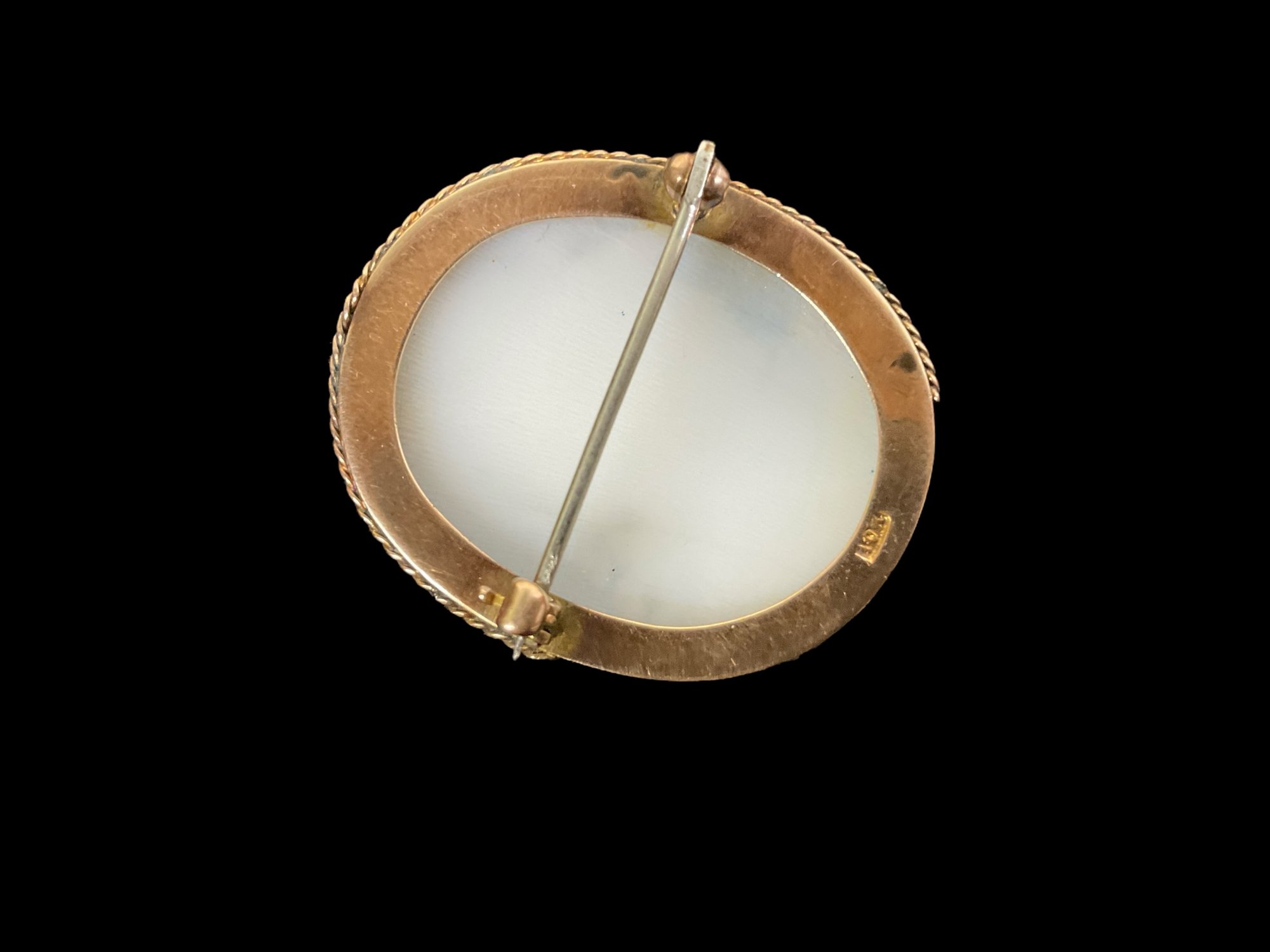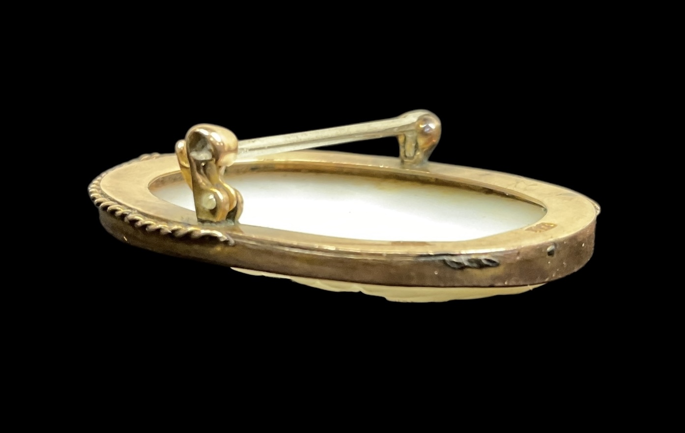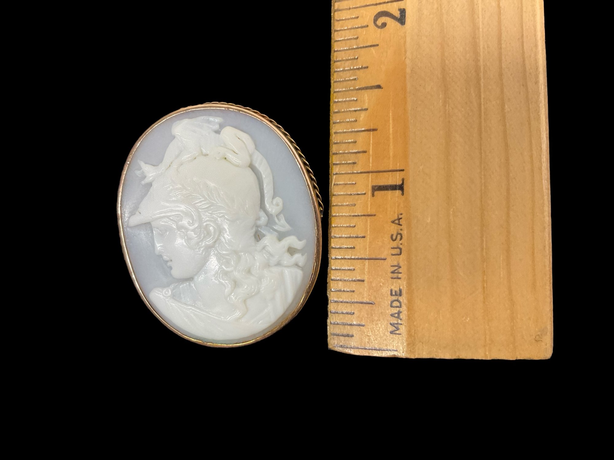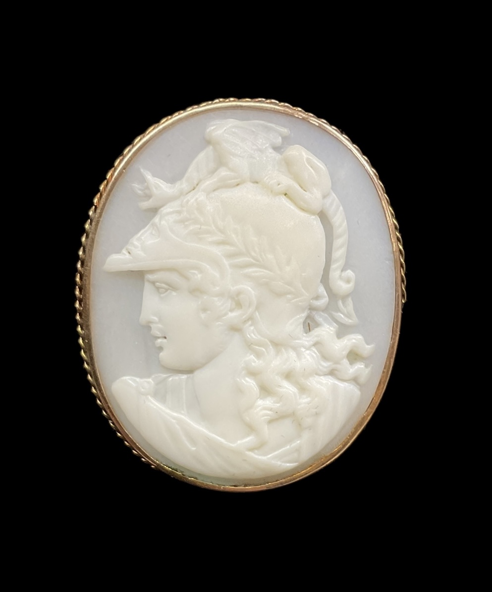 Exceptional Victorian 10K Yellow Gold Cameo Brooch With Bust Of Minerva. In fair condition with part of the decorative rope twist missing from the bottom half of the brooch. It is approx. 1 3/8” tall.