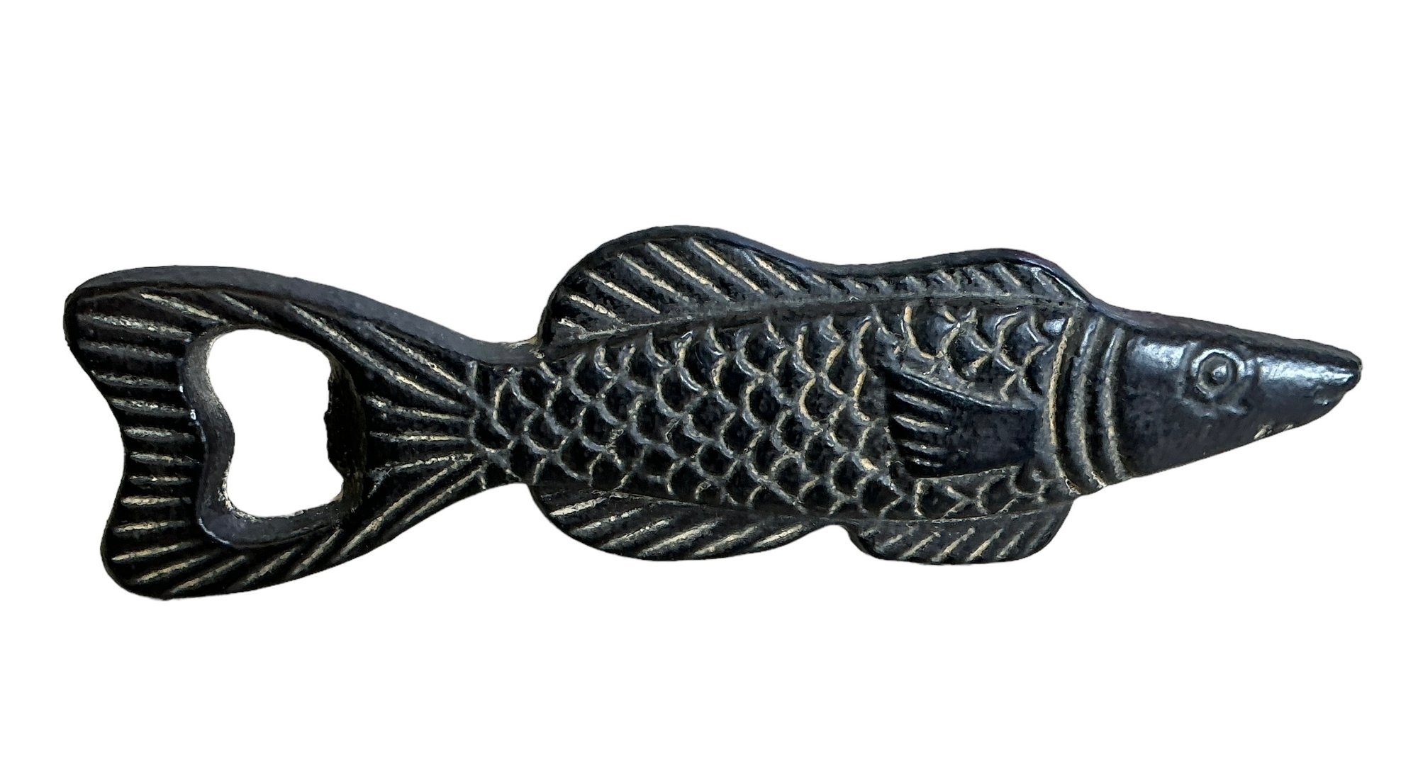 Fish Bottle Opener. In good used condition. Made from some sort of metal. It is approx. 6.5” long.