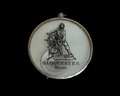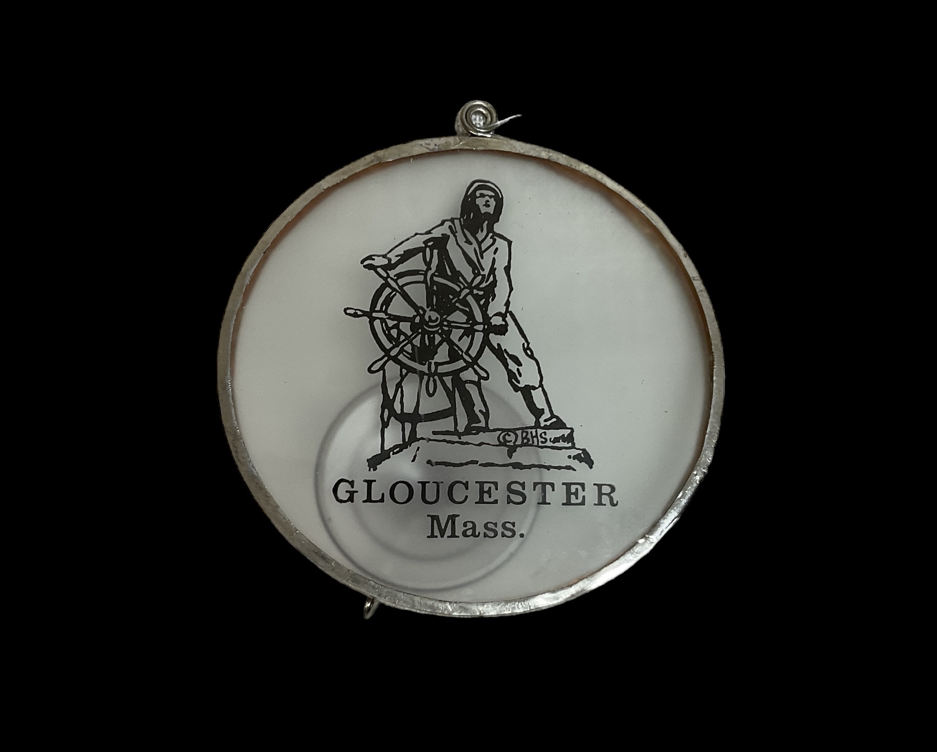 Fisherman Statue Hanging Glass Ornament, measures 4 inches in diameter.