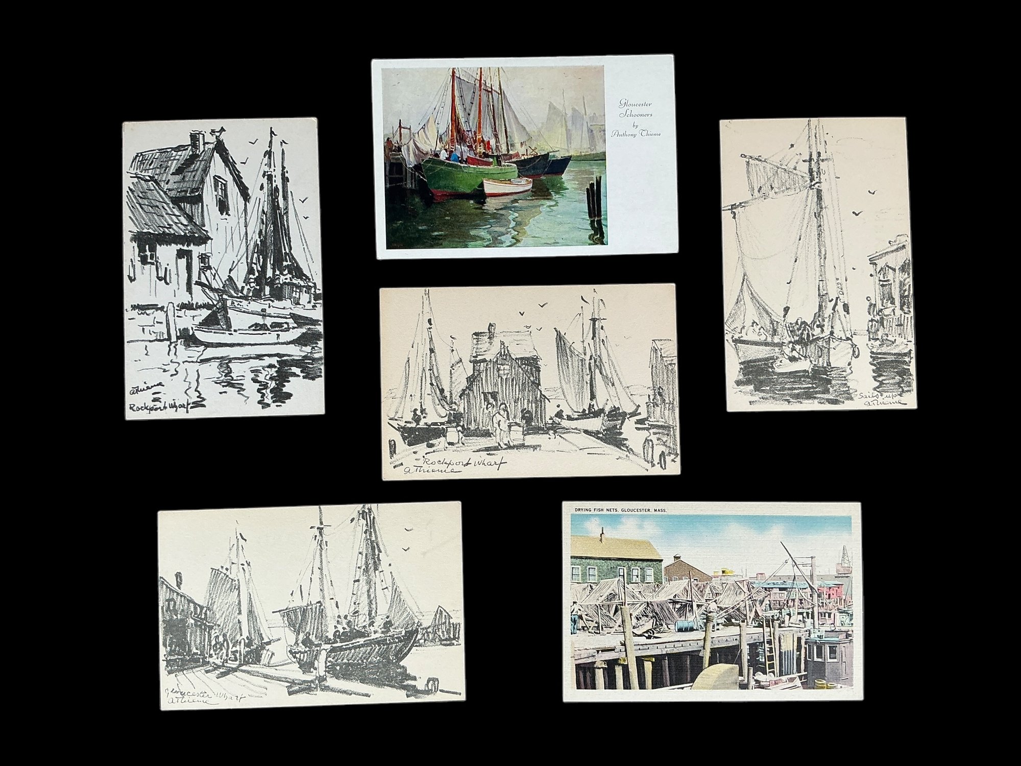 Five Vintage Anthony Thieme Postcards And Drying Fish Nets Gloucester Mass Frank Shurtleff Postcard. All in good unused condition. Each is approx. 5.5” by 3.5”.