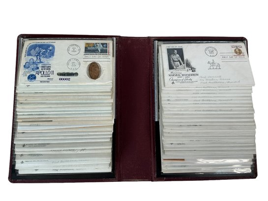 Folder Of 96 First Day Covers From The 1950s Through 60s Apollo 11 Stuart Davis Automotive Industry Etc. All in good condition. The binder is approx. 11” by 8” by 2.25”.