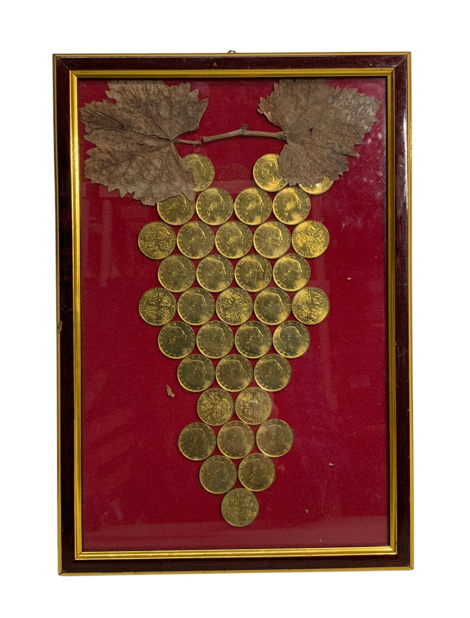 Folk Art Assemblage With Vintage Italian 200 Lire 1993 Coins. In fair condition with one loose coin and one missing coin, please see photos. It is approx. 12.5” by 8.5”.